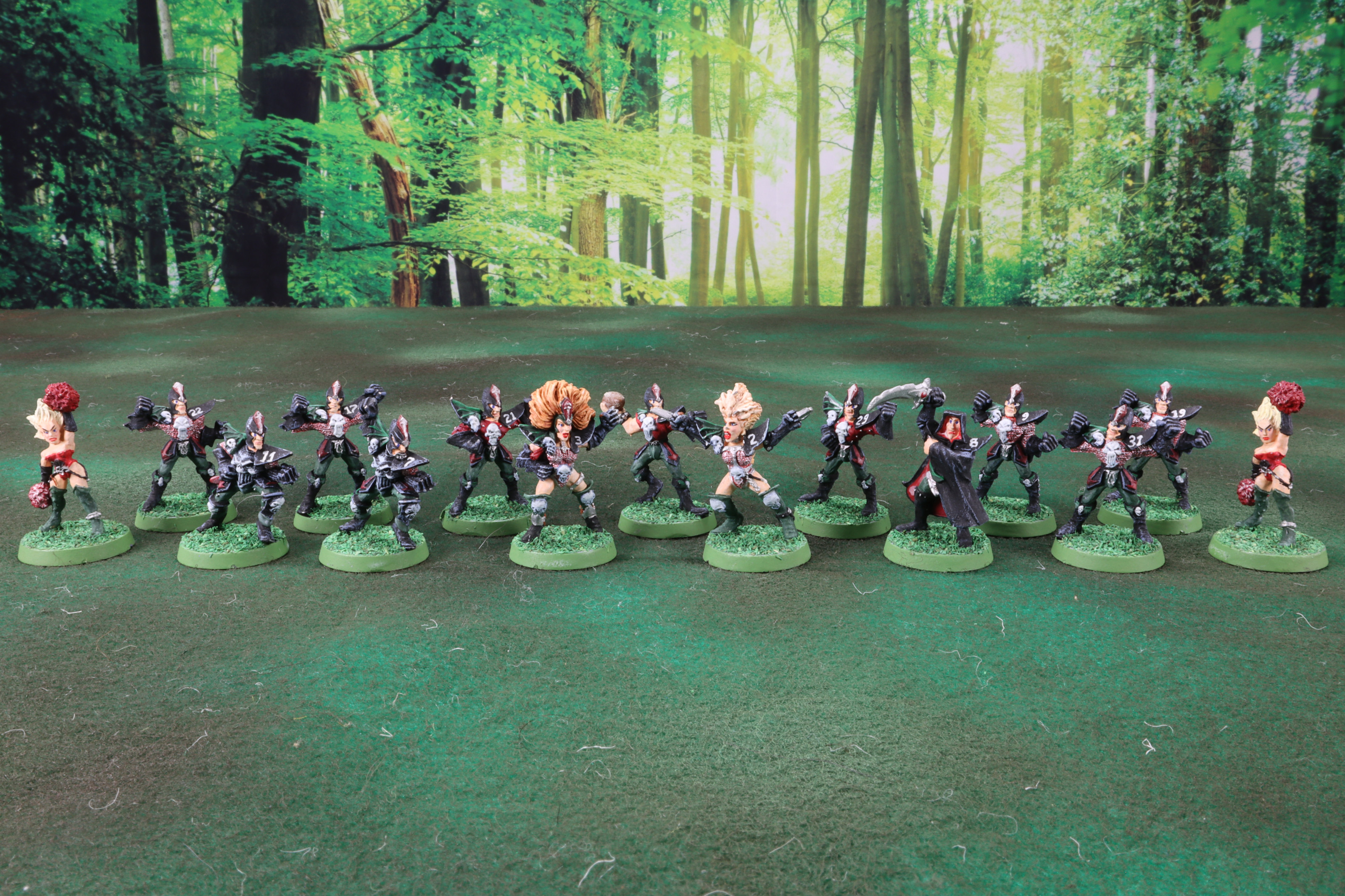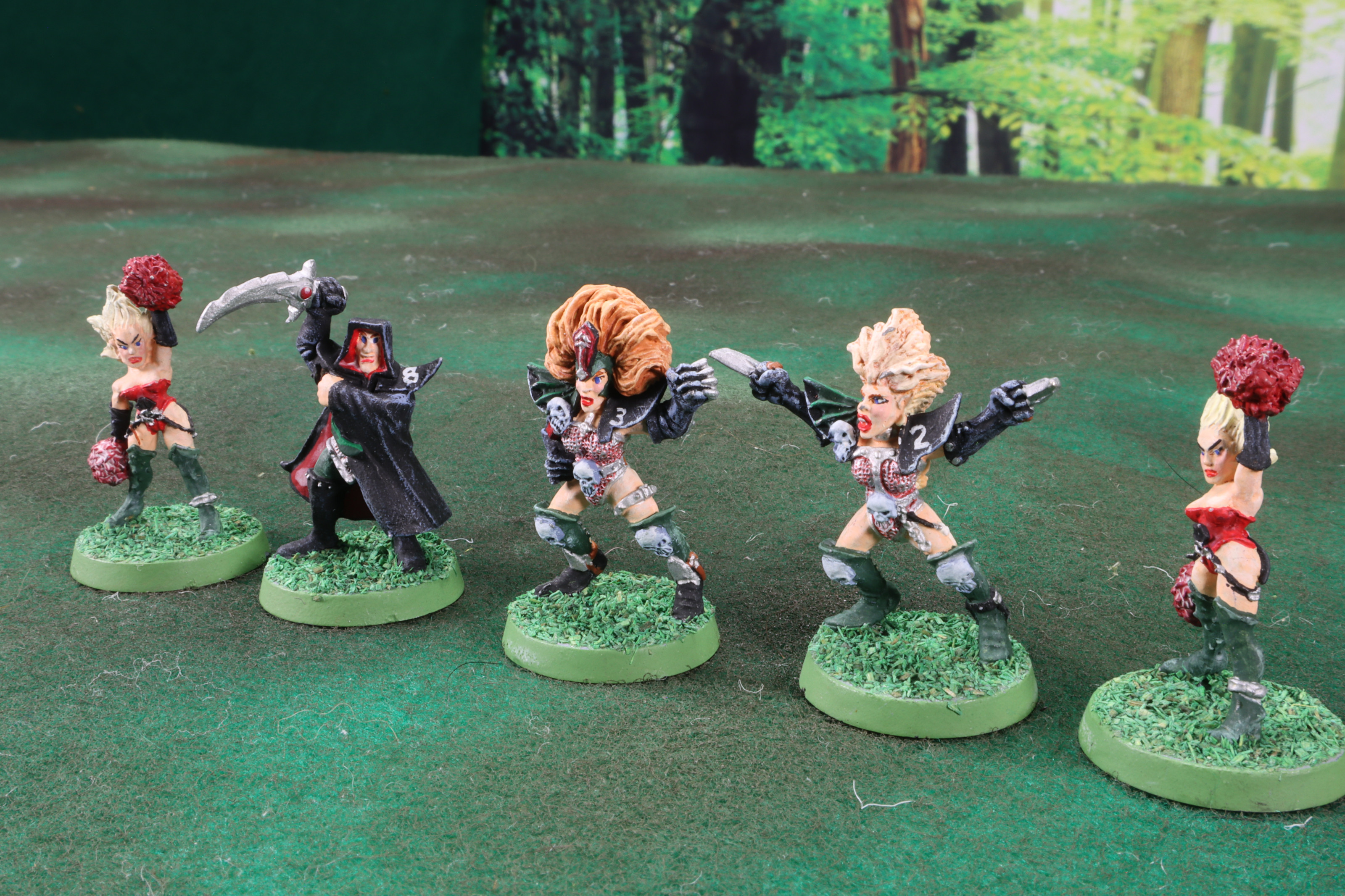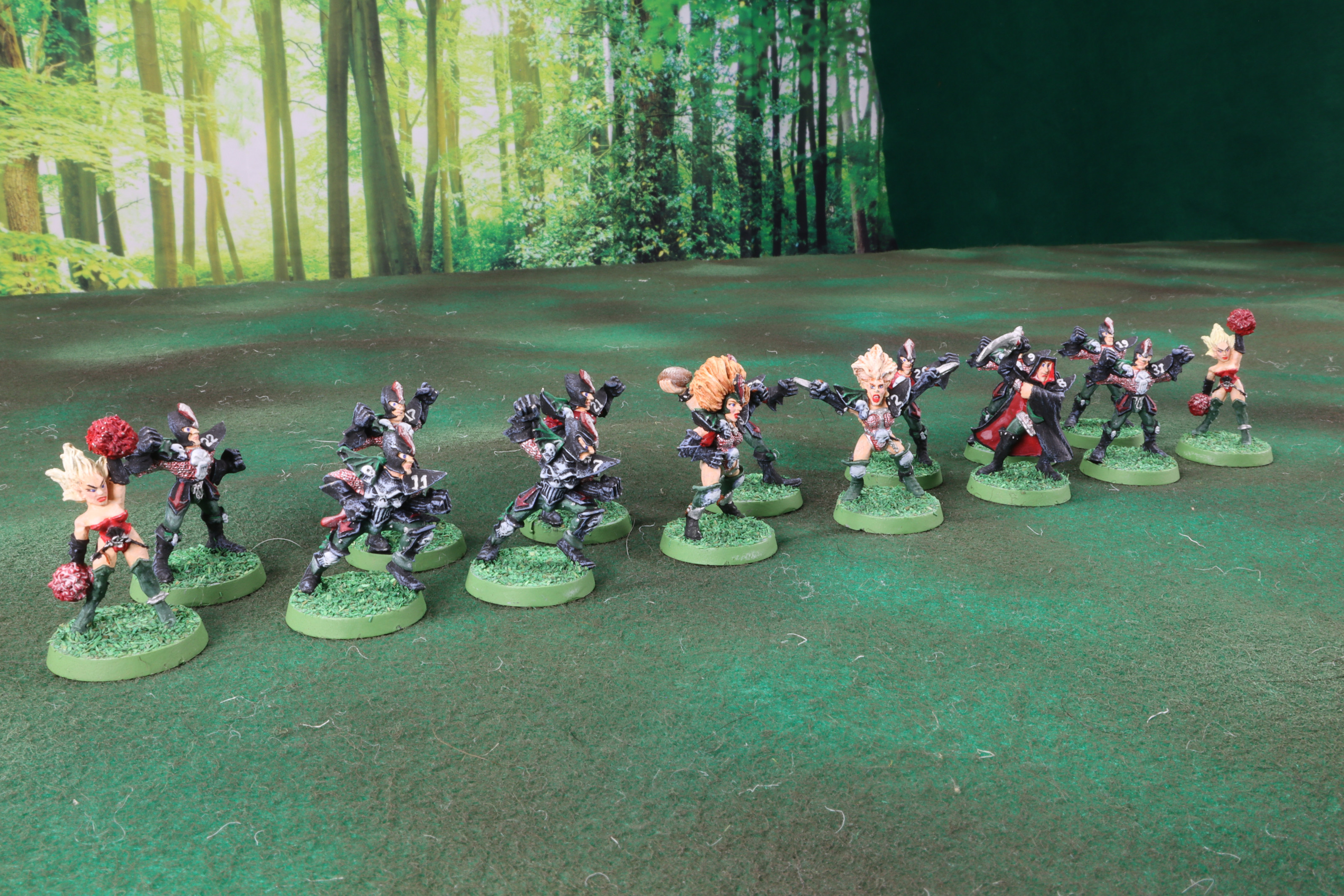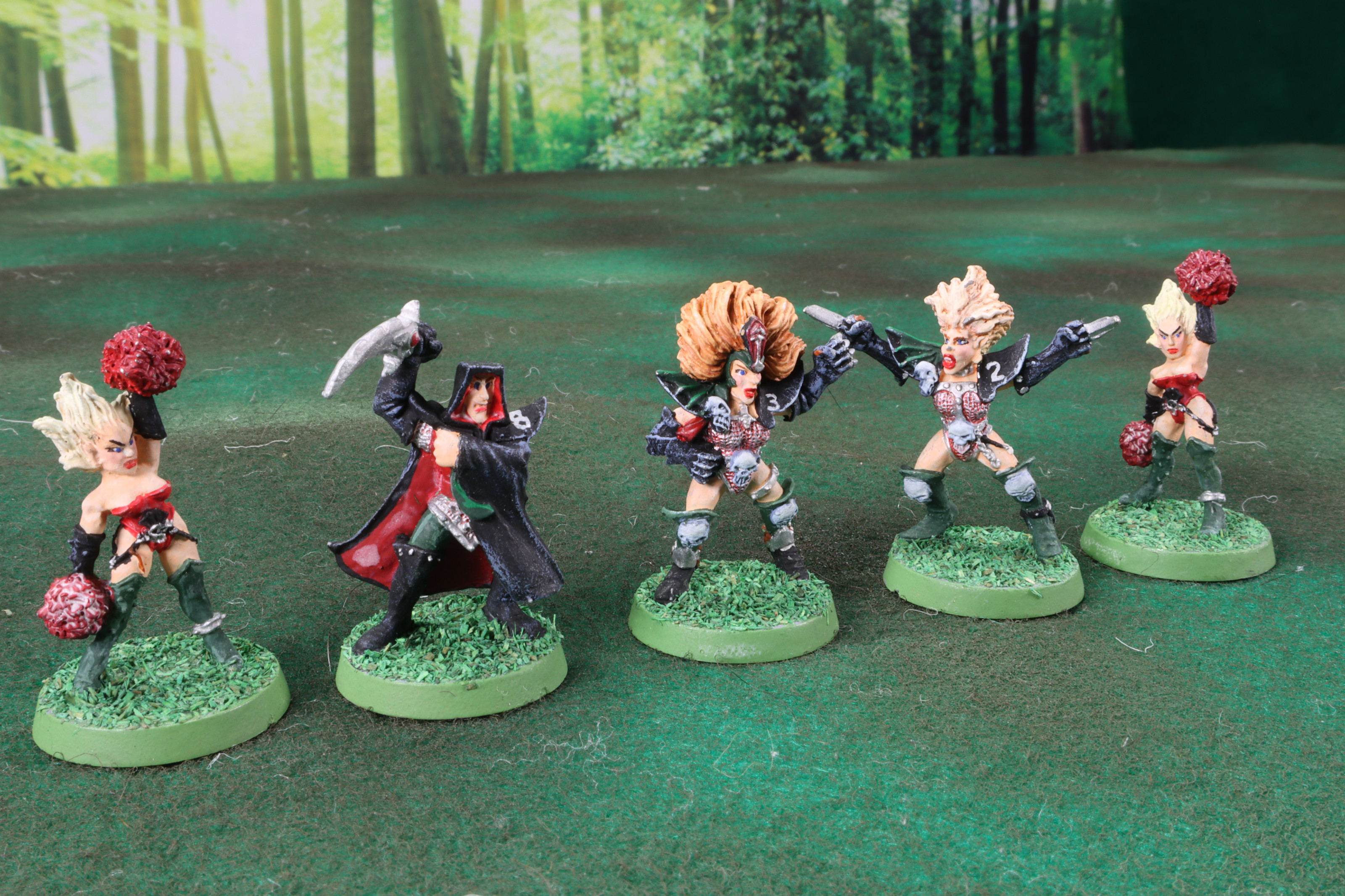 In the front row you see some blitzers and star players. The female star in the center with the big red hair was politically-incorrectly named "Bee-atch". The back row has some cheer leaders and various players. I love the black, red, and green uniforms.