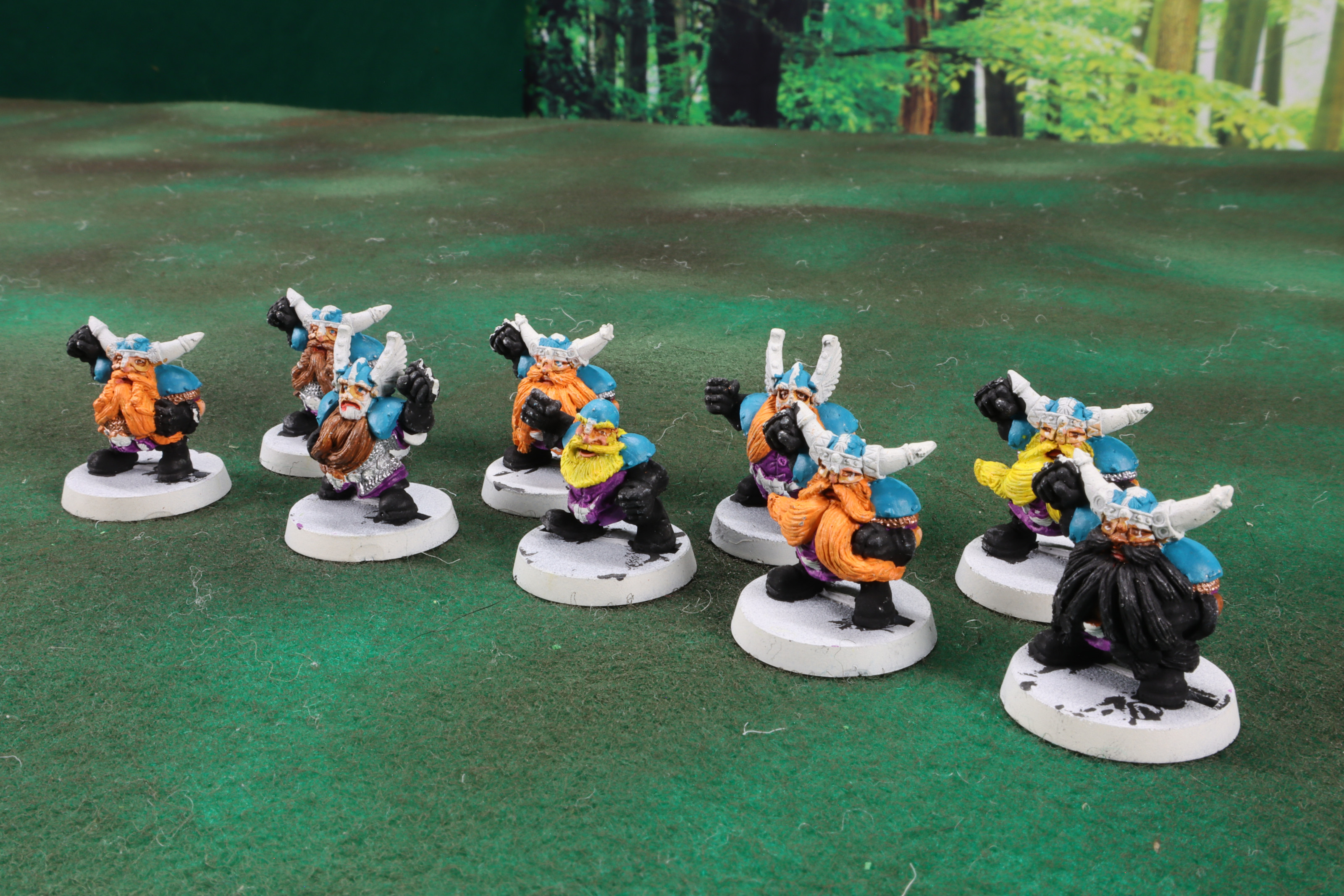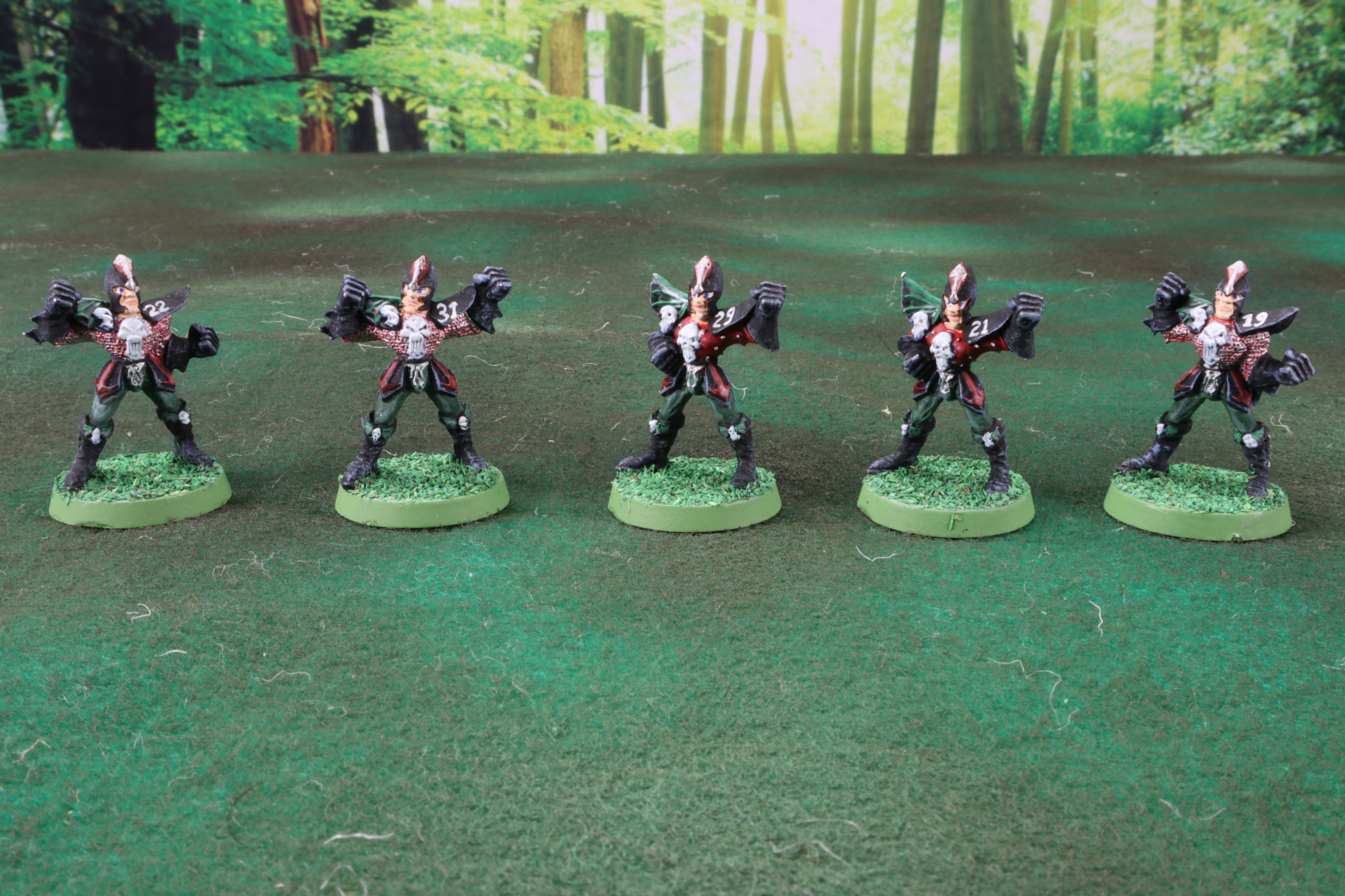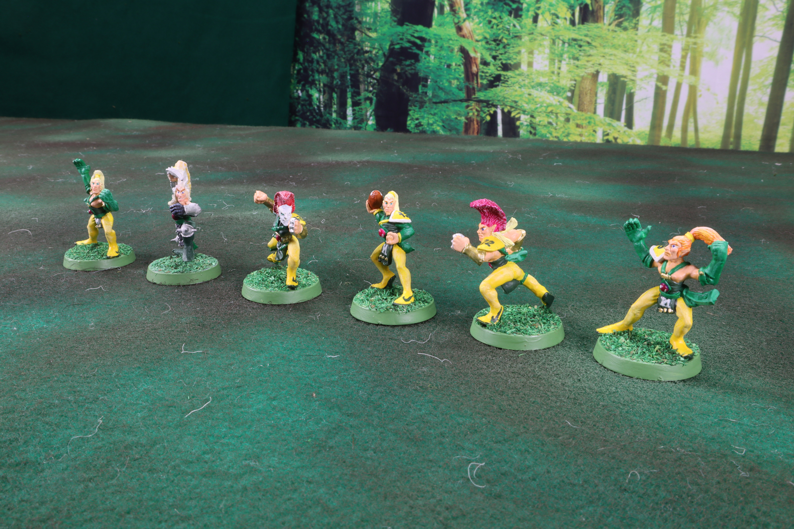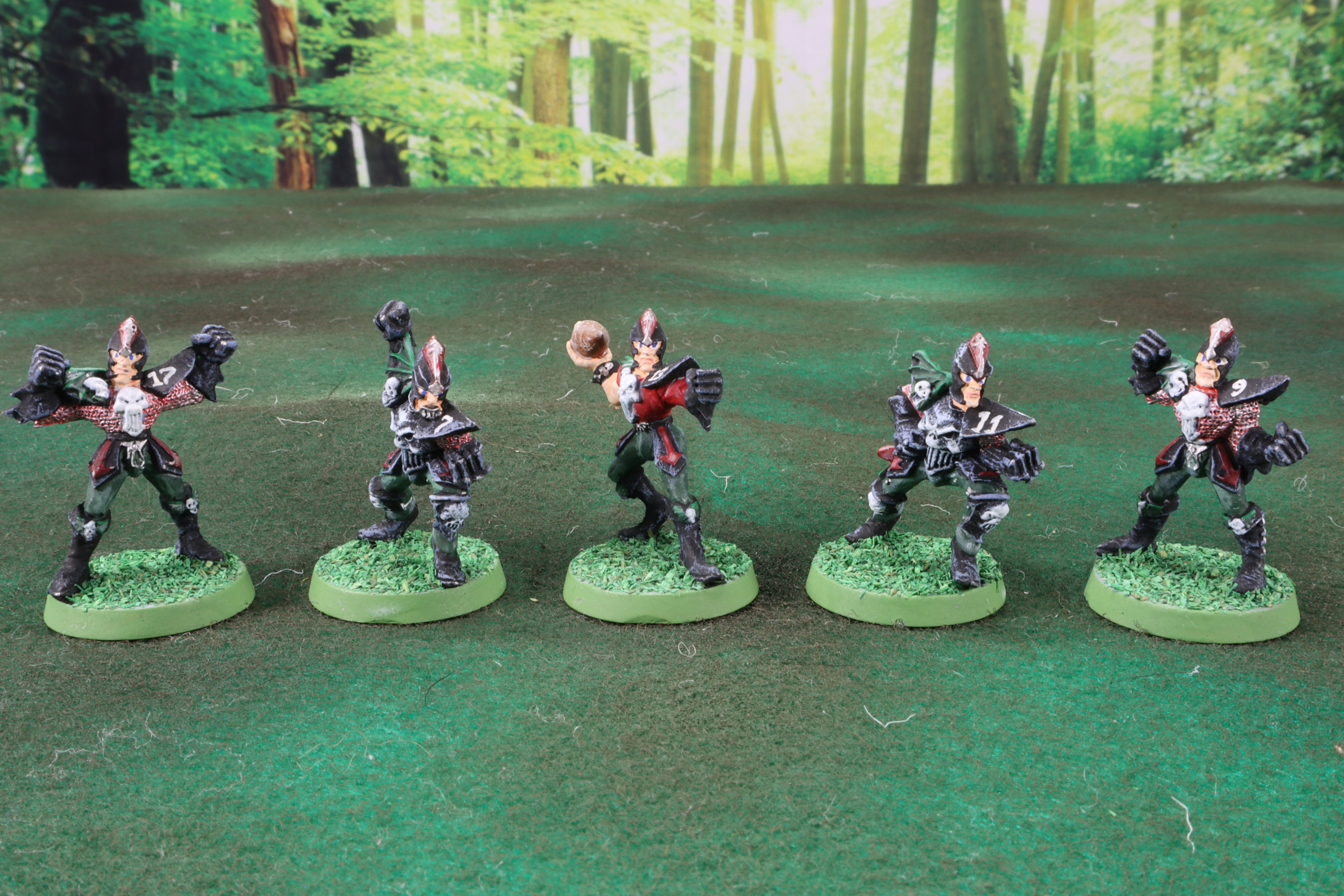 A few more linemen to round out the team. The players on the ends are special players that I never finished. Blood Bowl players do not have facing in the game, and round bases work better. I do not know why I used square bases, I must have run short.