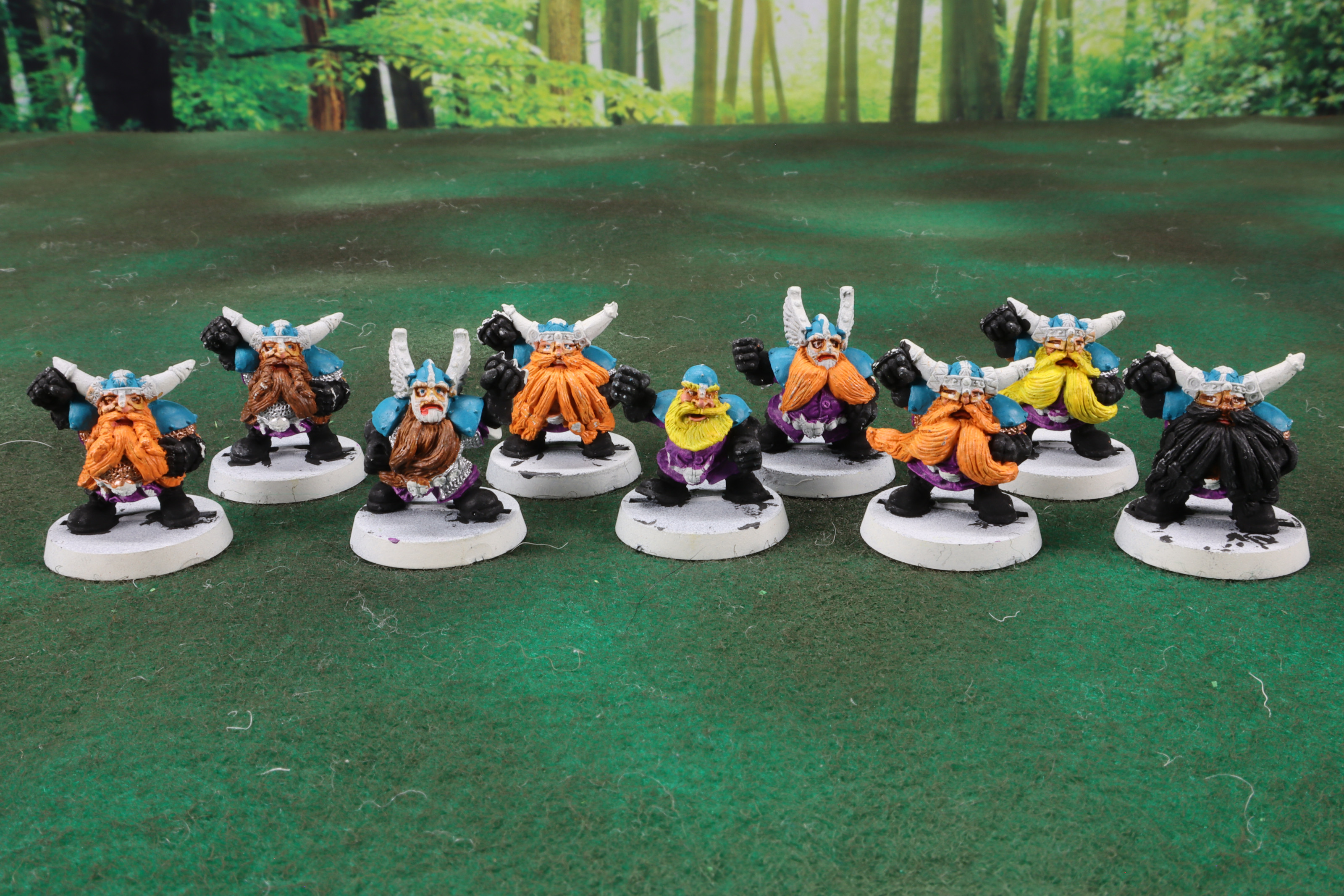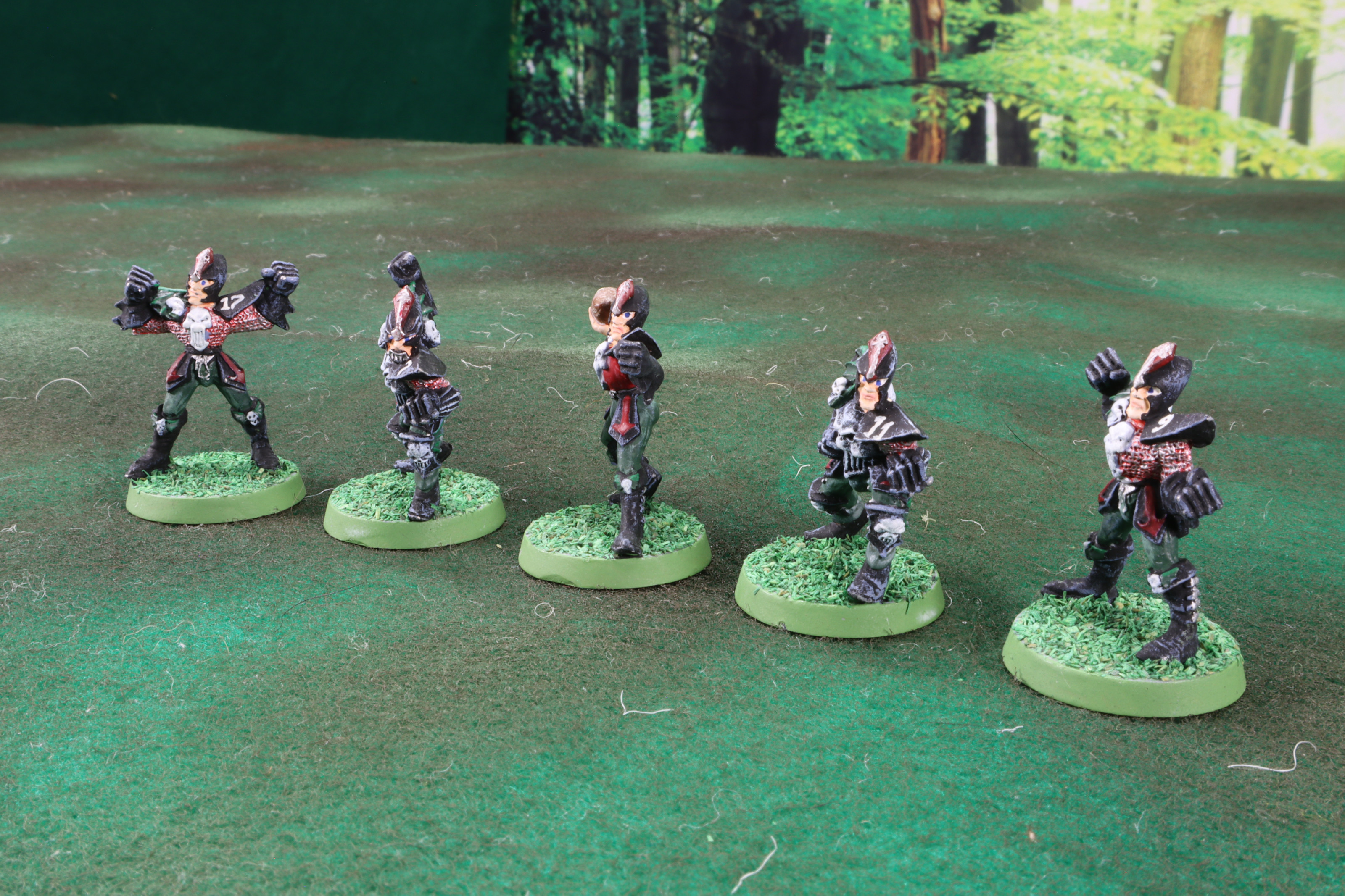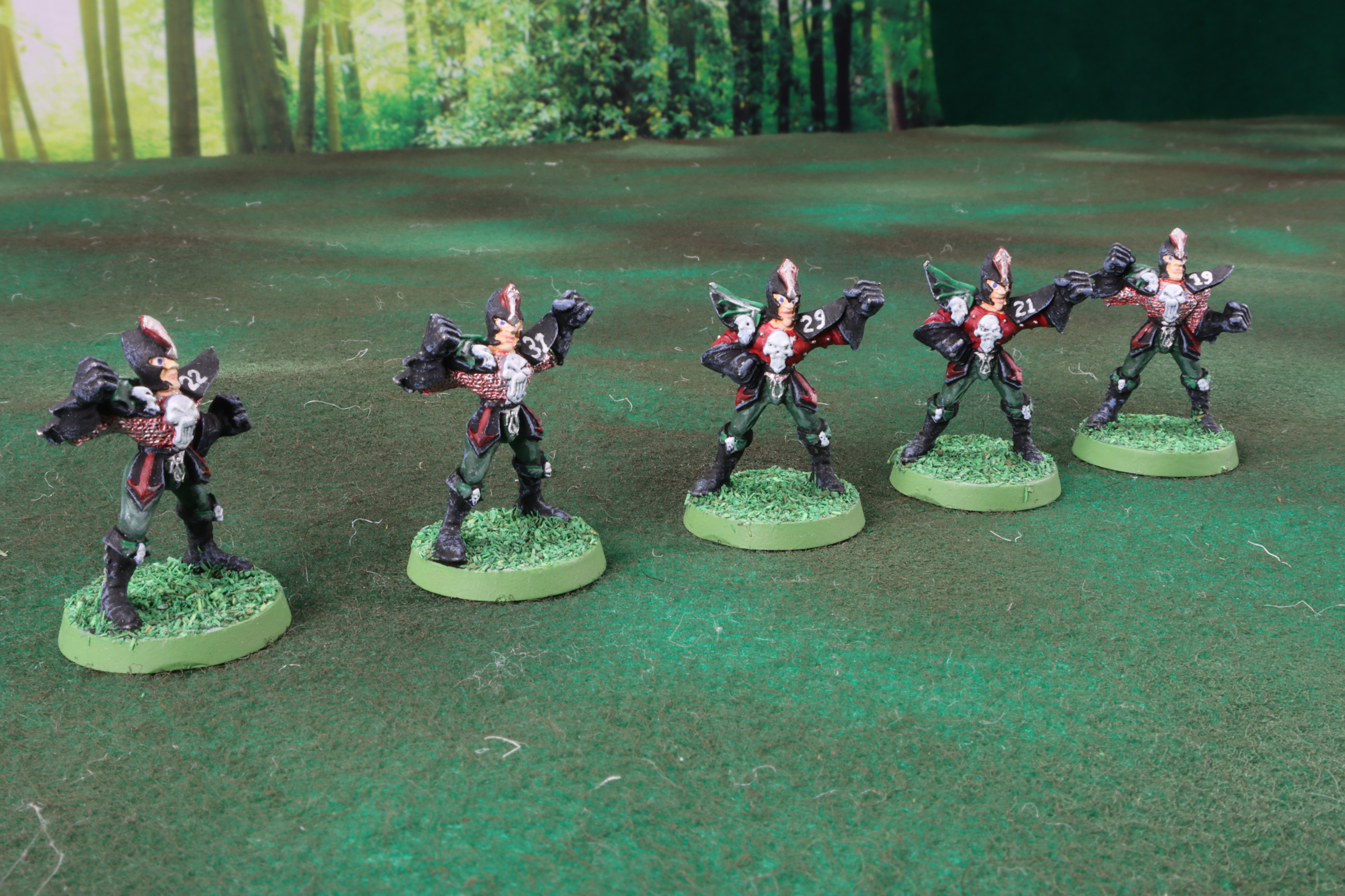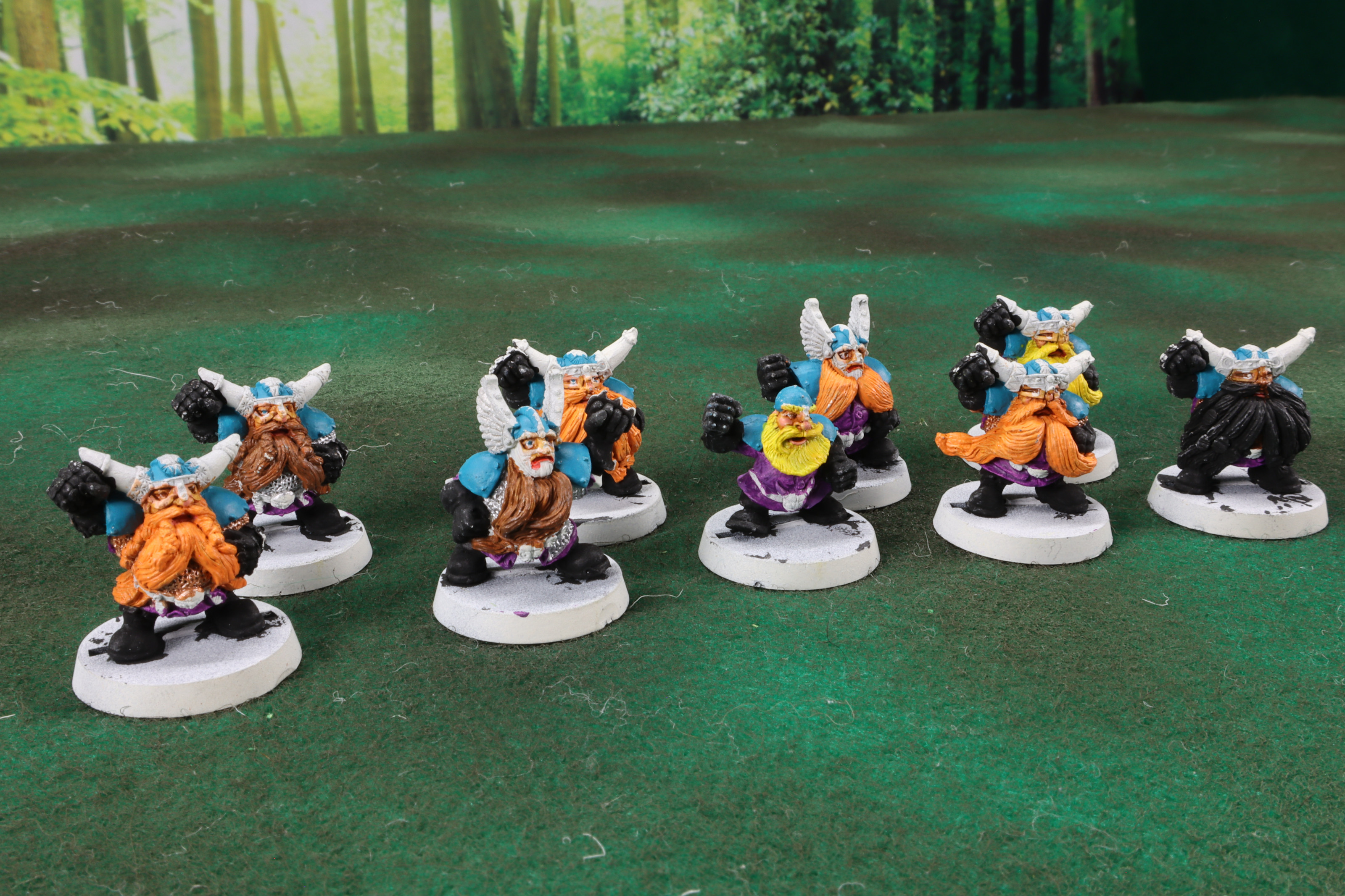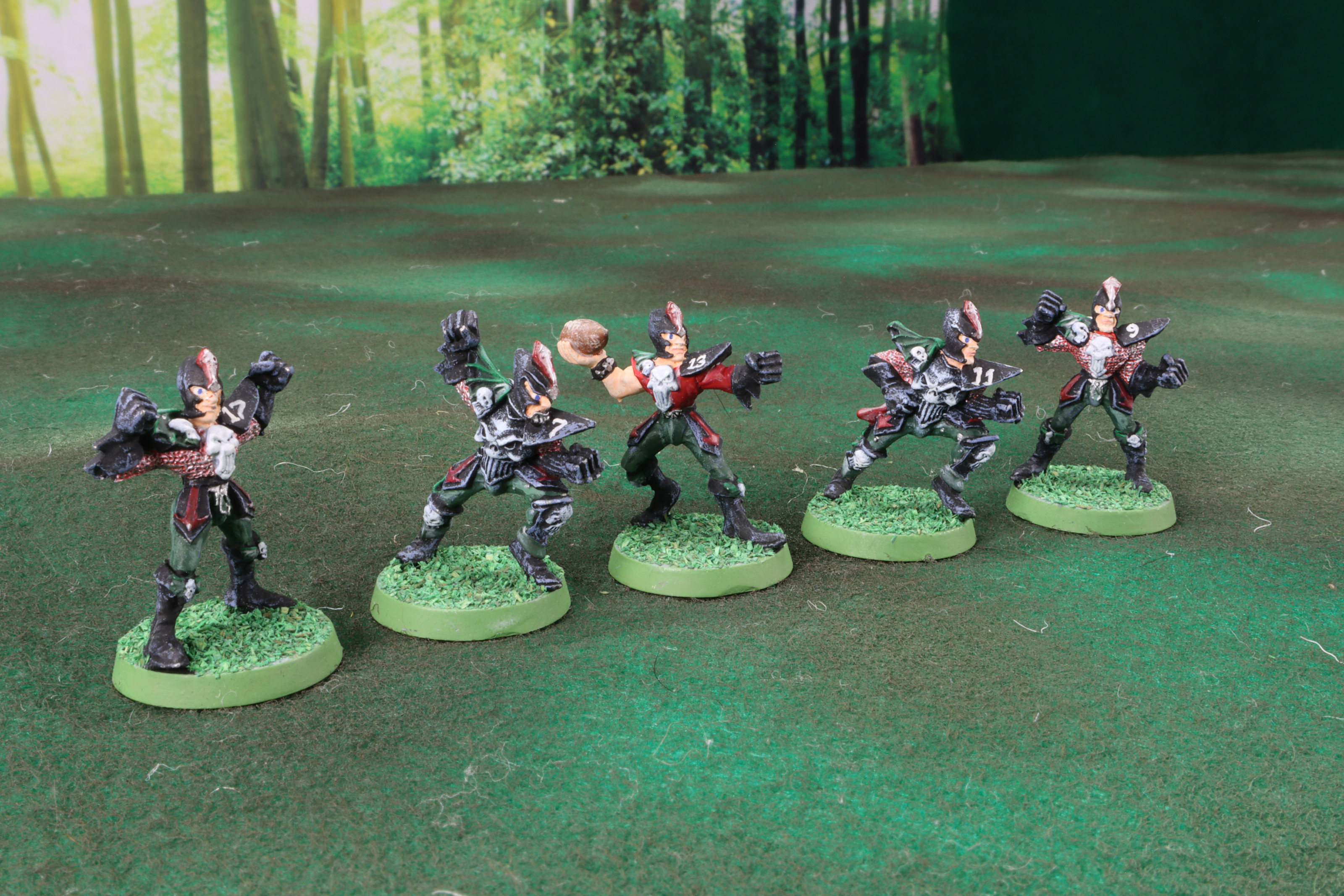 A few more linemen to round out the team. The players on the ends are special players that I never finished. Blood Bowl players do not have facing in the game, and round bases work better. I do not know why I used square bases, I must have run short.