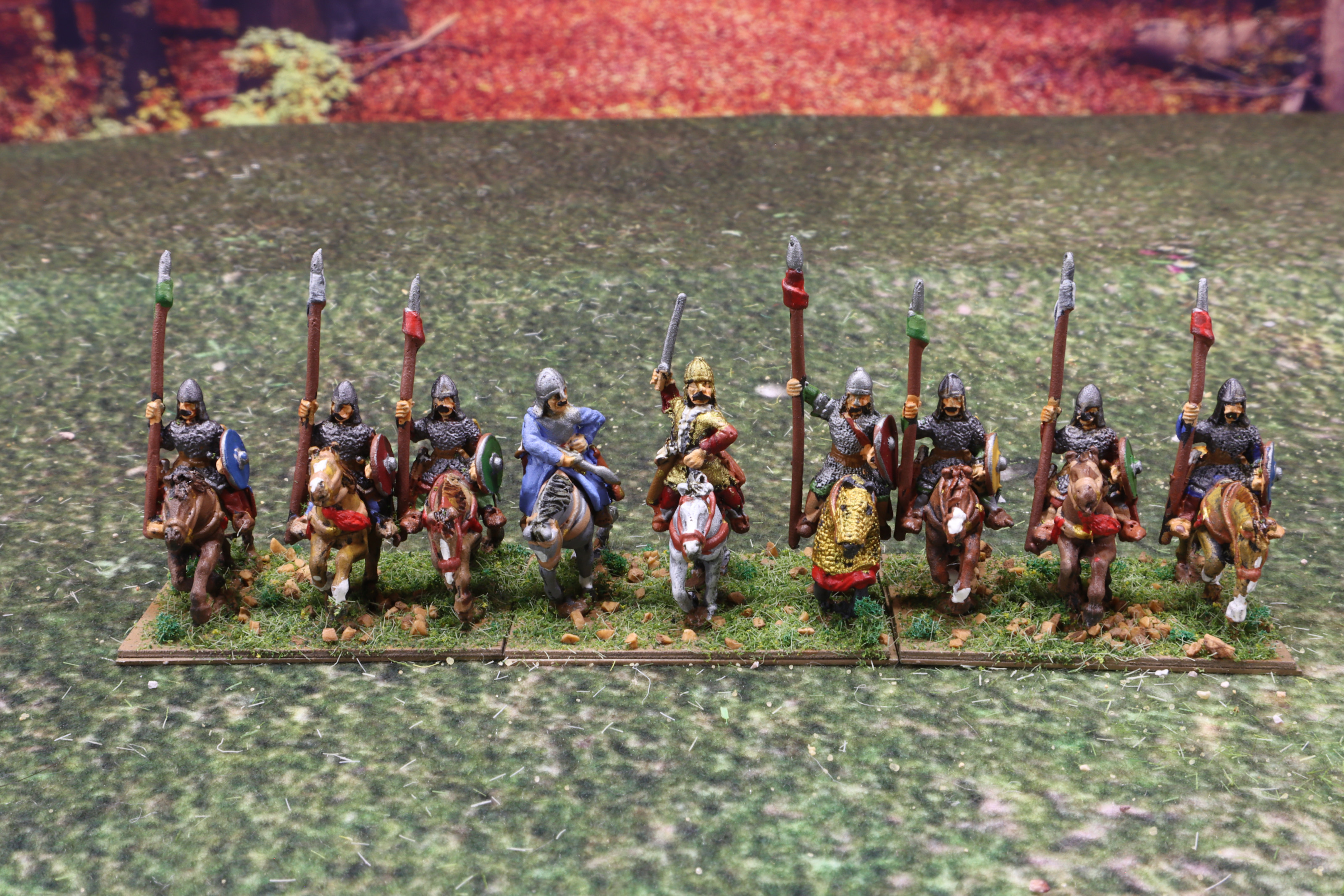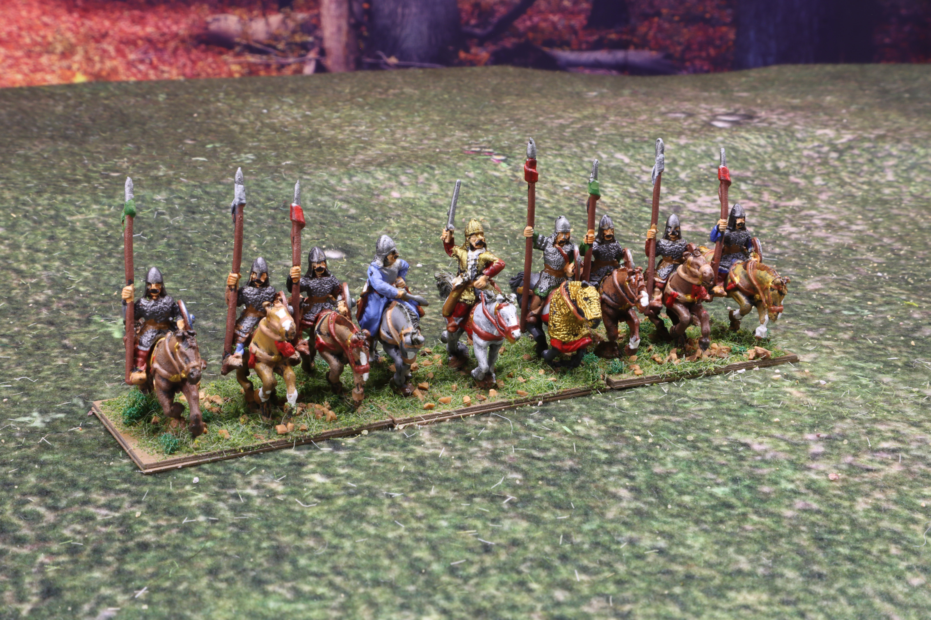 I really like the General in the center and his retinue, the one on the left with a mace, and the one on the right with a cataphracted armored horse. The Bulgars were really good at metal smithing and trading with China and the Middle East, so I made much of the metal work and costumes really rich looking.