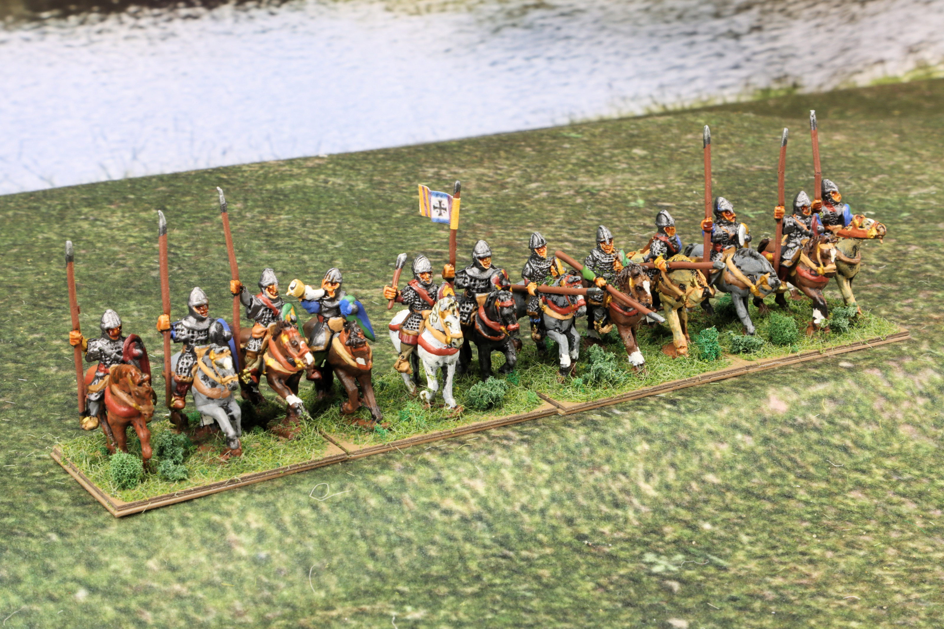 Three milites with couched lances are next to the standard bearer. On the flanks, six more knights.