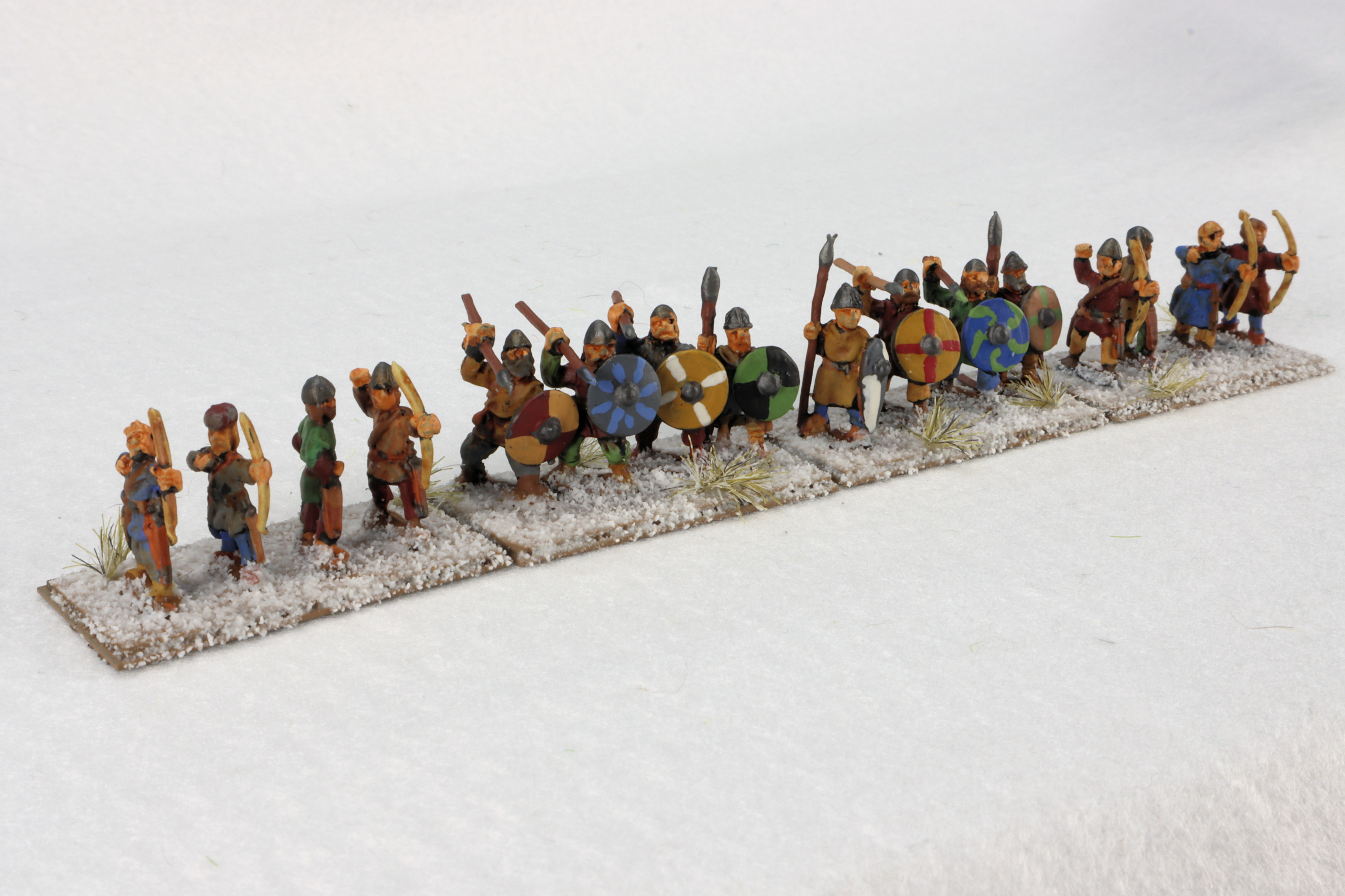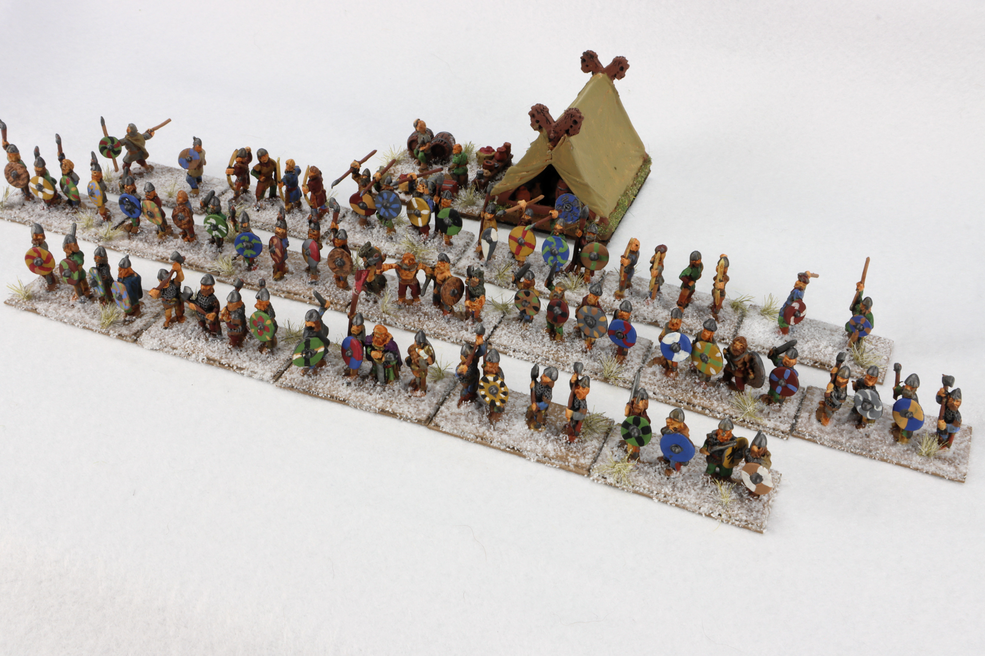 Baueda has been generous with the figure count for the army. First of all, you get an army general with three retainers. Then you get about twenty huscarl figuress in chain mail armor with blades (swords and axes). You get four berserkers and about twenty hird in tunics with blades. There are about twelve auxilia and psiloi with spears and javelins. There are eight bow and two camp thralls. Finally there is a resin camp tent and a few camp items.