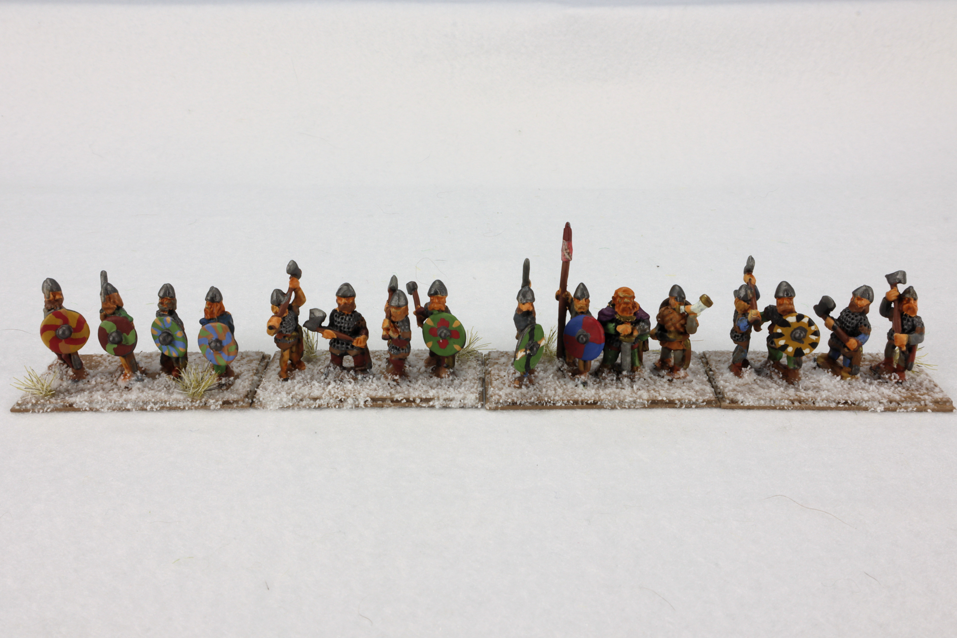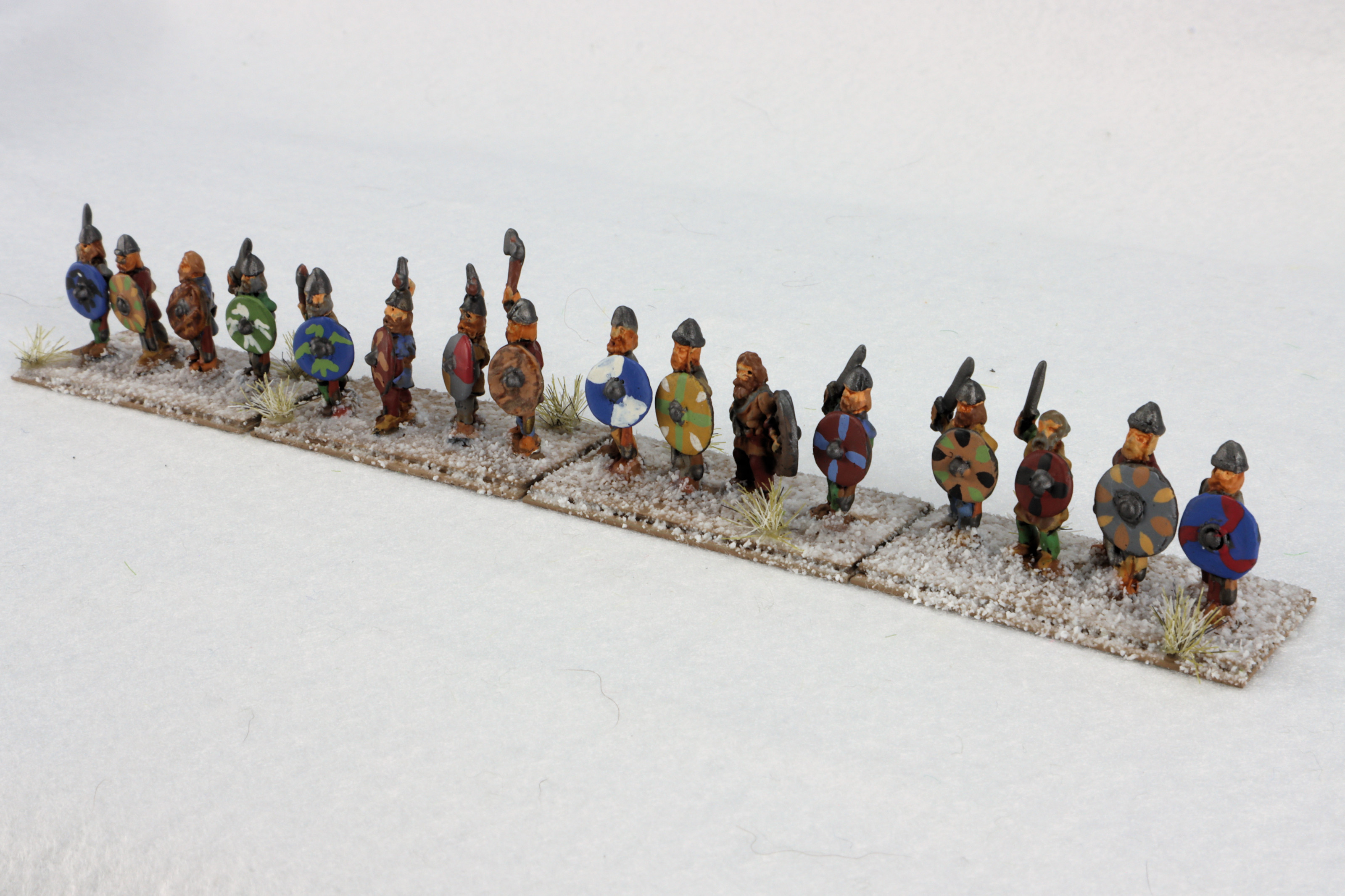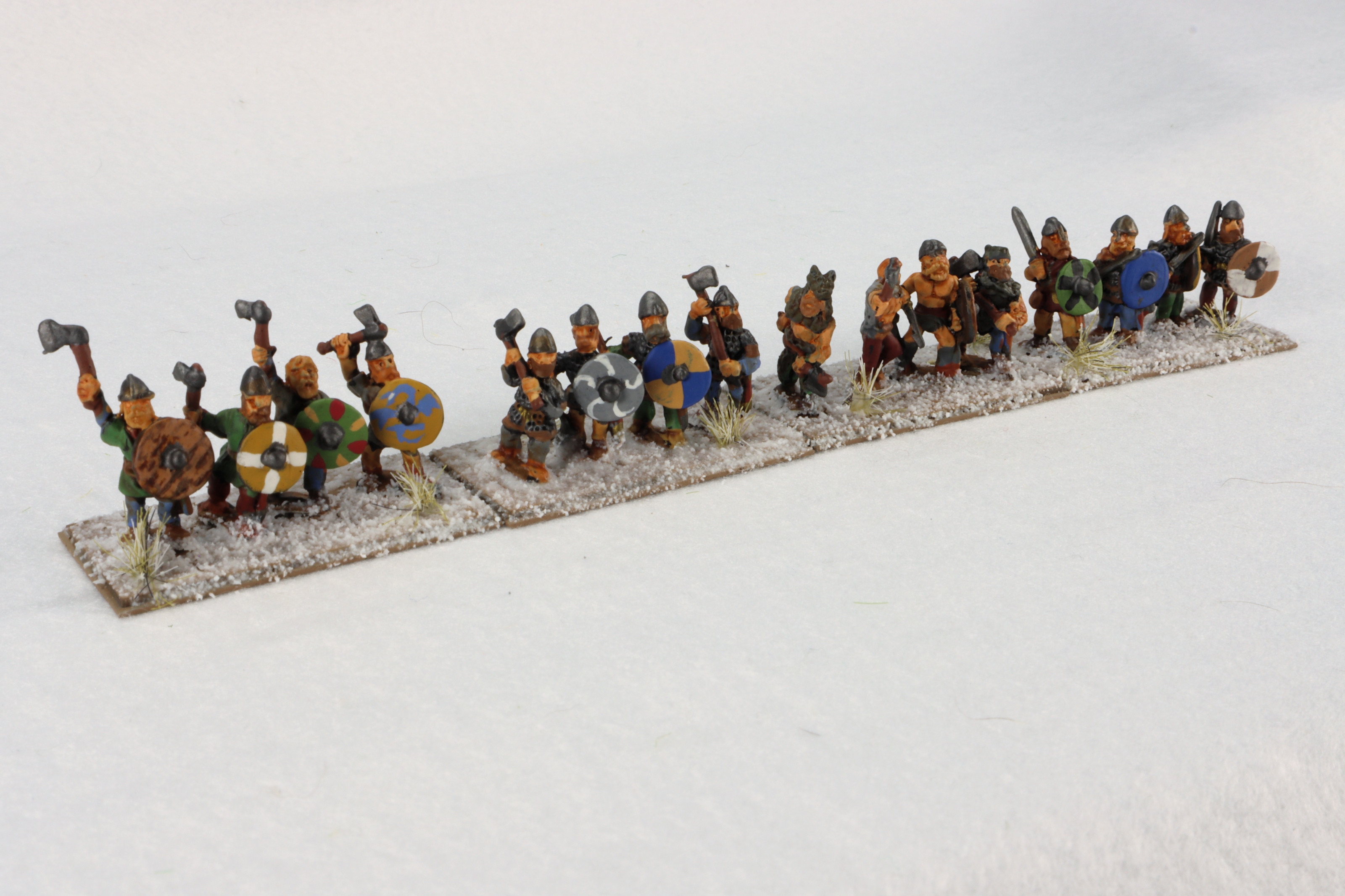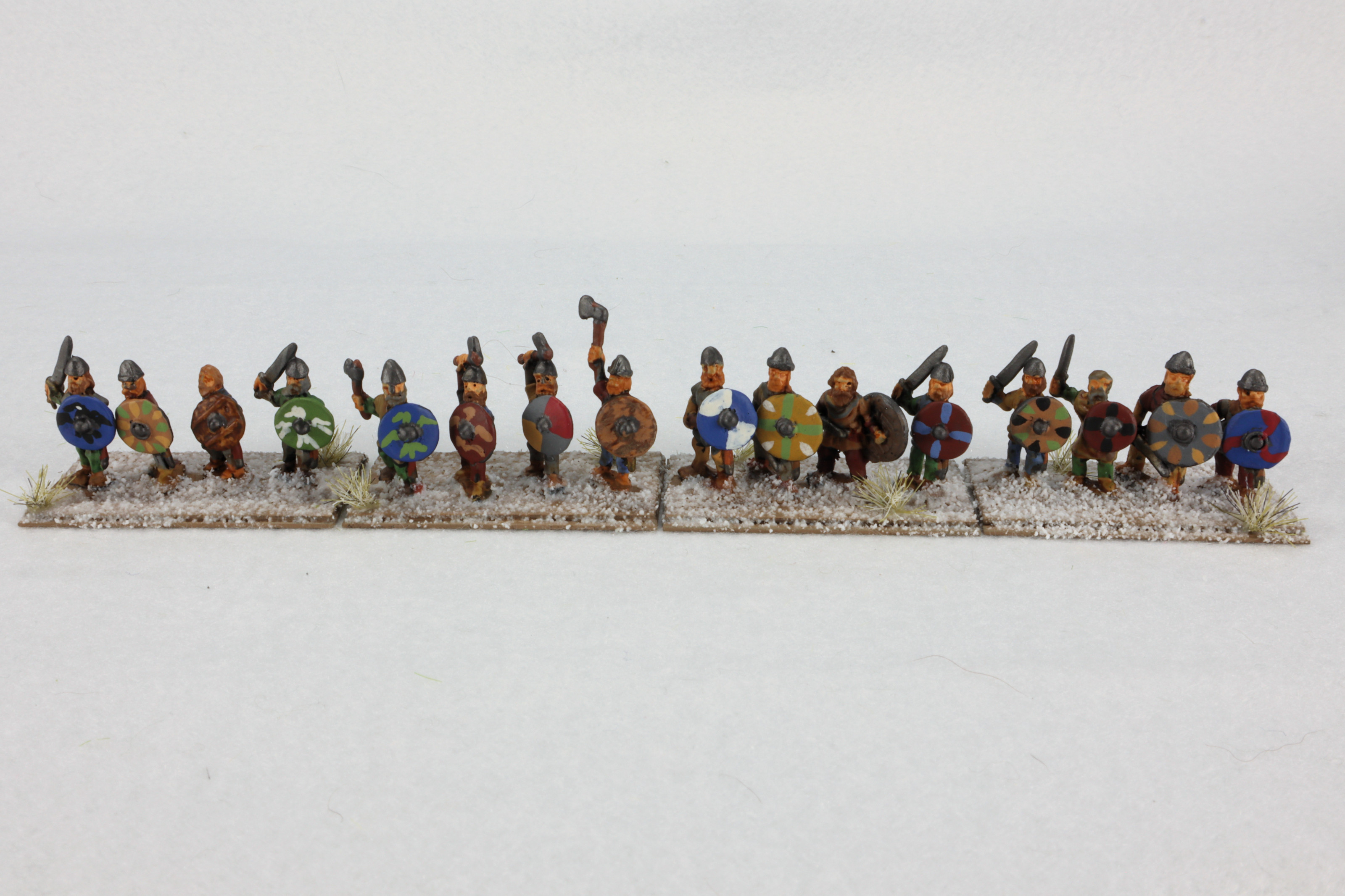 These figures are based about four warriors per stand for use with the De Bellis Antiquitatus miniature game, also known as DBA. DBA is popular because there are hundreds of armies in the rules lists, and each one has exactly 12 units. This Viking Raider army is from DBA version 3.0 (released 2014), the third book of armies (spanning the Dark Ages to early Medieval period), and is the 28th army of the book. is also known as DBA3 III/40.