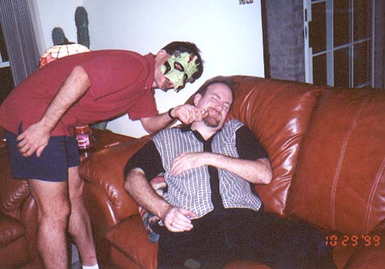 Oh my, we've startled him with a hideous Frankenstein mask.