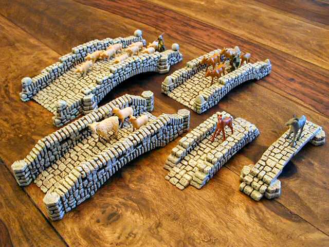 Here are a few words about the design and construction of five unique bridges for 25mm (1/64th) scale miniature gaming using plaster blocks cast from one Hirst Arts silicone mold (#74), the Fieldstone Bridge Mold. The photo at right shows all five bridges. Two bridge pathways are about 5 feet (1.5m) wide, two are about 10 feet (3m) wide, and the largest is about 15 feet (4.5m) wide. Of course these are scale widths, in reality the paths are 1 to 3 inches (25mm to 75mm) wide.