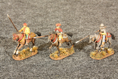 Here are three mounted light horsemen galloping left. These figures have lances.