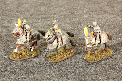 Here are the same three mounted heavy horsemen galloping right. According to the Perry instructions, this chunky horse armor is of the Italian style.
