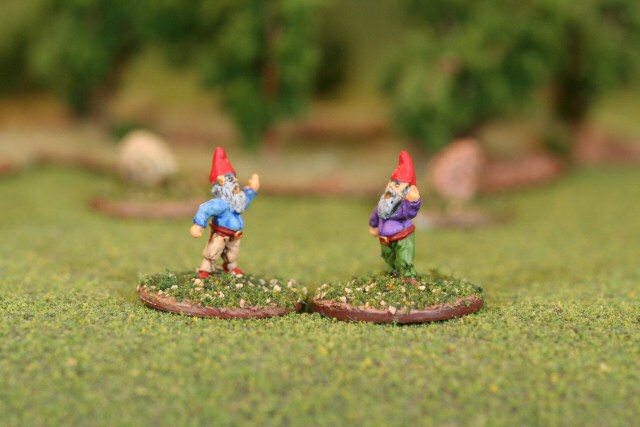 This article describes an eclectic set of 28 mm miniaturesfrom Ginfritter's Gnomish Workshopand Mega Miniatures.Even for my strange tastes, this is quite an unusual set of miniatures.First, we start off with Ginfritter's 28 mm Lawn Ornaments (Fairy004).These are the typical concrete and plastic lawn ornaments yousee in a garden.All the typical lawn ornaments are there: squirrel, flamingo, mushroom,snail, and gnome,or as my wife likes to call them, a "Gee - nome".This is quite an unusual subject for minis, but I immediately took a liking tothe strange topic and bought two sets.To throw a curveball on the whole matter, the tinygnome is flipping the bird.What better way to welcome scrutinizing passerbys to your gardenother than to let the little guys flip the old one-finger salute."Welcome to my garden. Now sod off!"