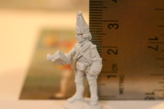 The previous naked metal photo is a bit difficult to appreciate, but this pictureshows the figure primed with gray paint and looking like a clay sculpture.Impressive.Lots of detail in the uniform and a unique pose of a battlefield warrior reading a book.As you can see, the 1 to 2 mm thick base brings the top of the figure's skull up to the 28 mmheight.The impressive mitre cap brings the total model height to almost 35 mm.As this is my first Seven Years War figure and most of my painting is in the Dark Ages, I didquite a bit of research before painting.I eventually found nice reproduction reenactment gear at the The Seven Years War Websiteincluding a good close view of the British Grenadier mitre cap.It is simply amazing to me that there were regiments with such a beautiful and expensivecap when today such a cap costs $400.How the British army afforded so many caps, coats,kit, rifles, shoes and leggings,costing so many days wages, is nearly beyond my comprehension.