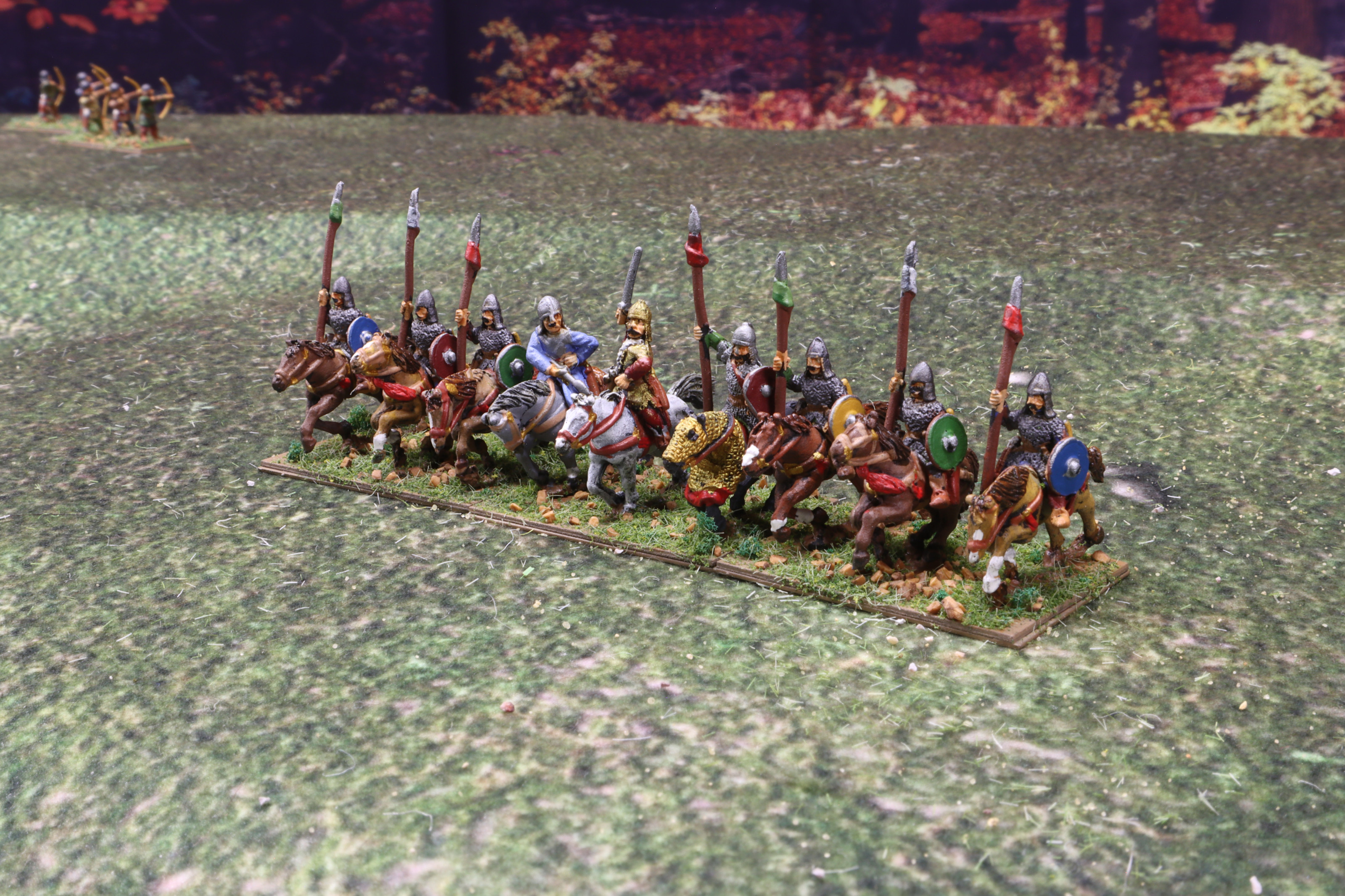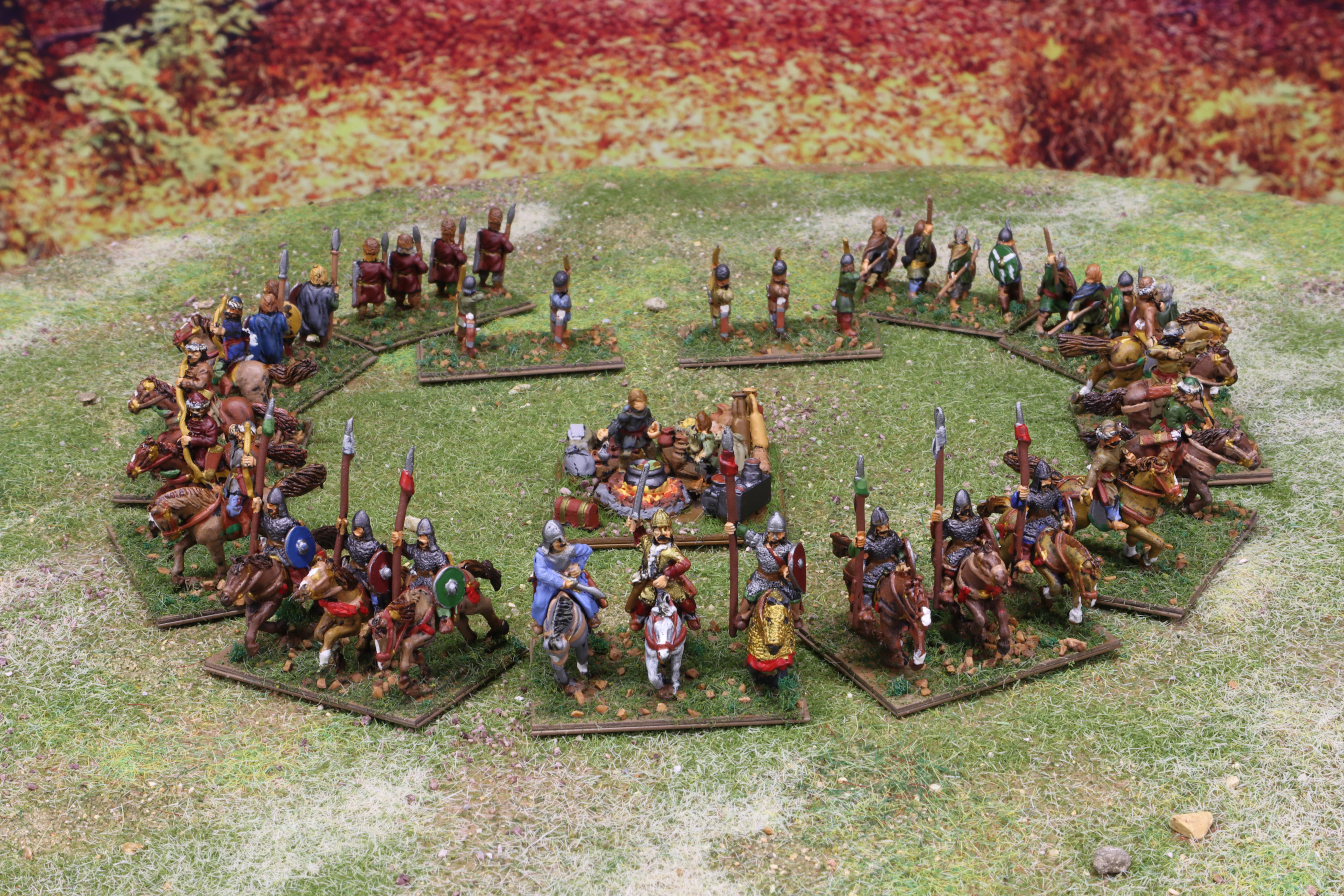 I really like the General in the center and his retinue, the one on the left with a mace, and the one on the right with a cataphracted armored horse. The Bulgars were really good at metal smithing and trading with China and the Middle East, so I made much of the metal work and costumes really rich looking.
