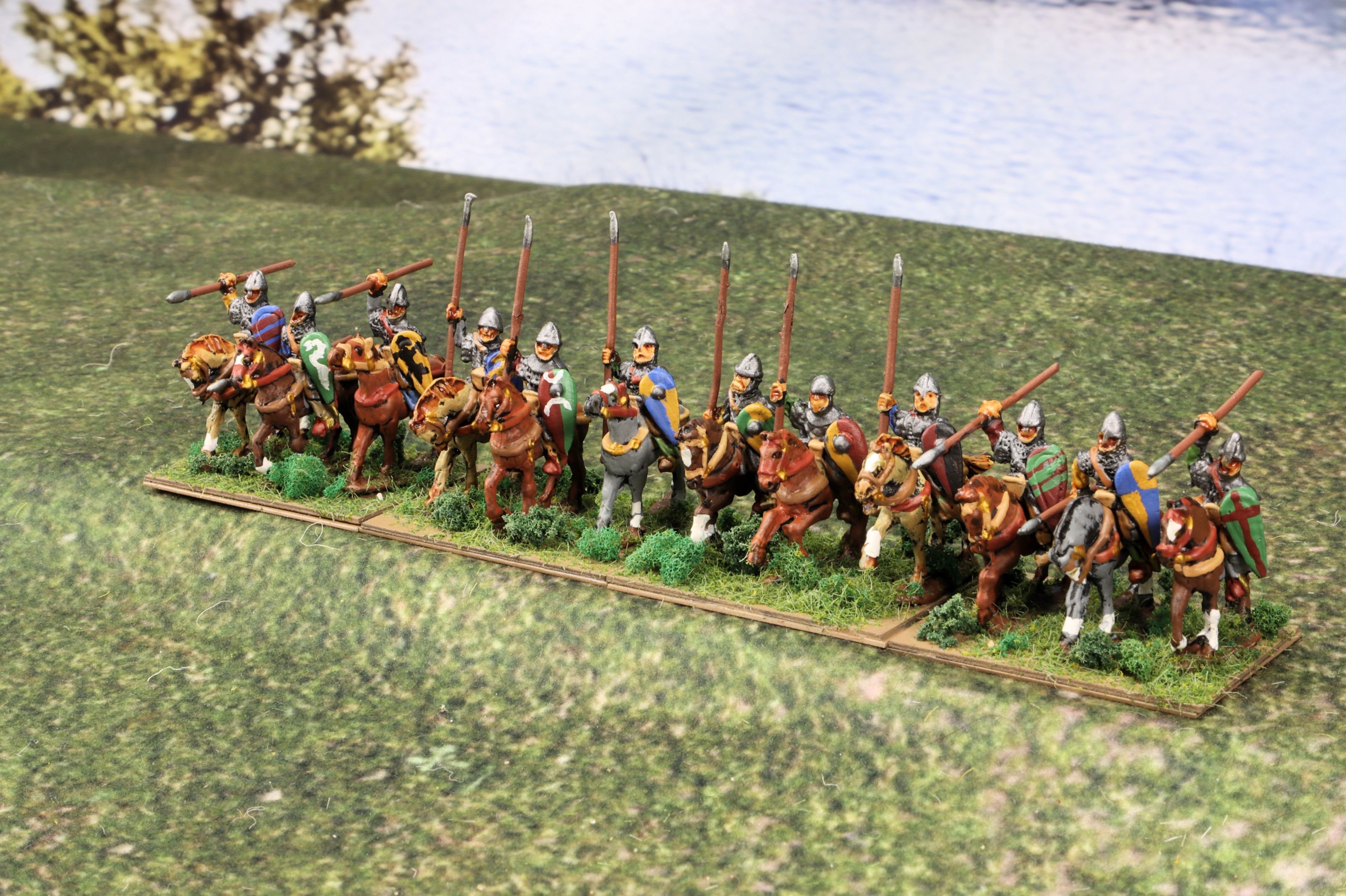 Three milites with couched lances are next to the standard bearer. On the flanks, six more knights.