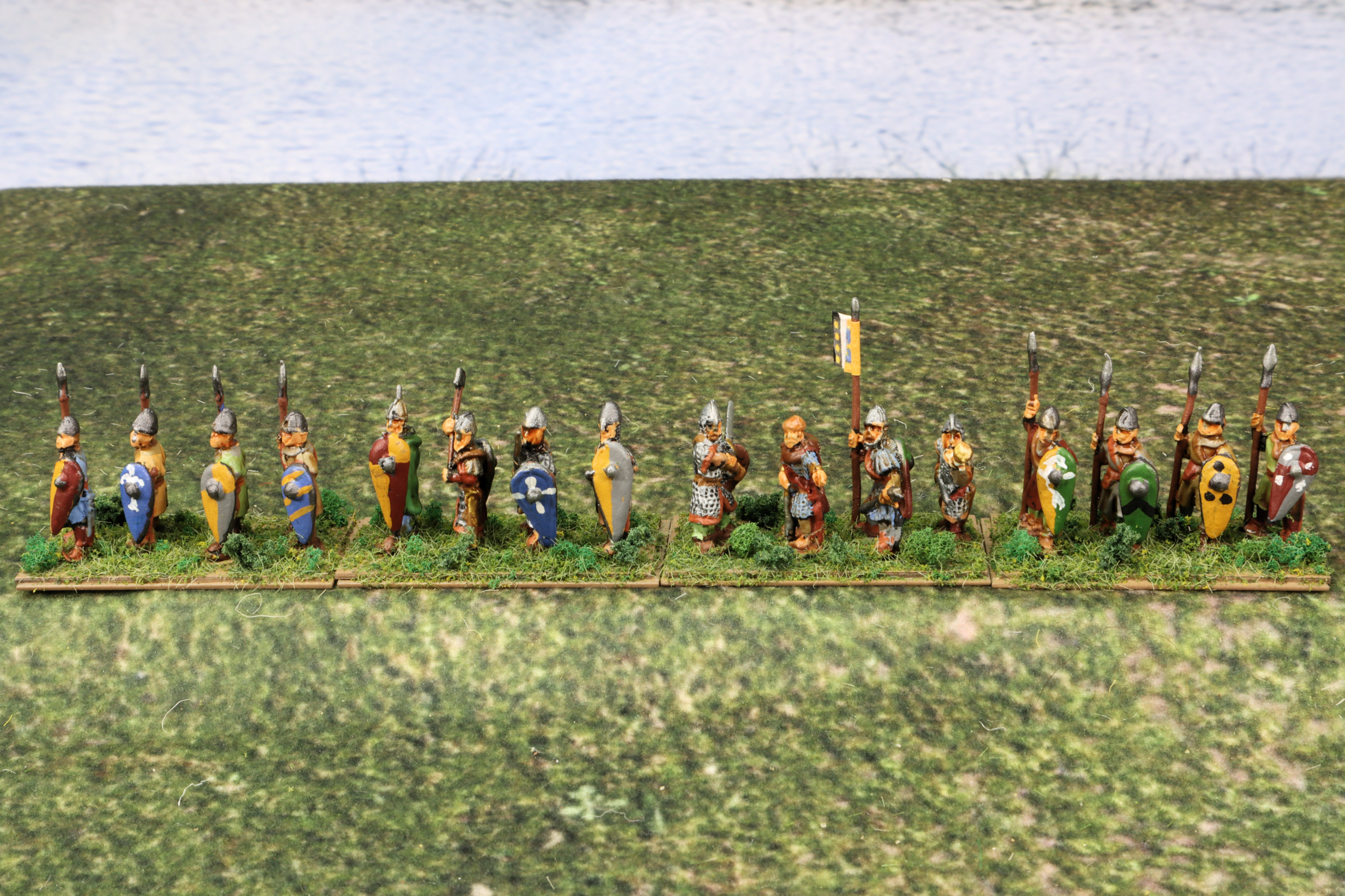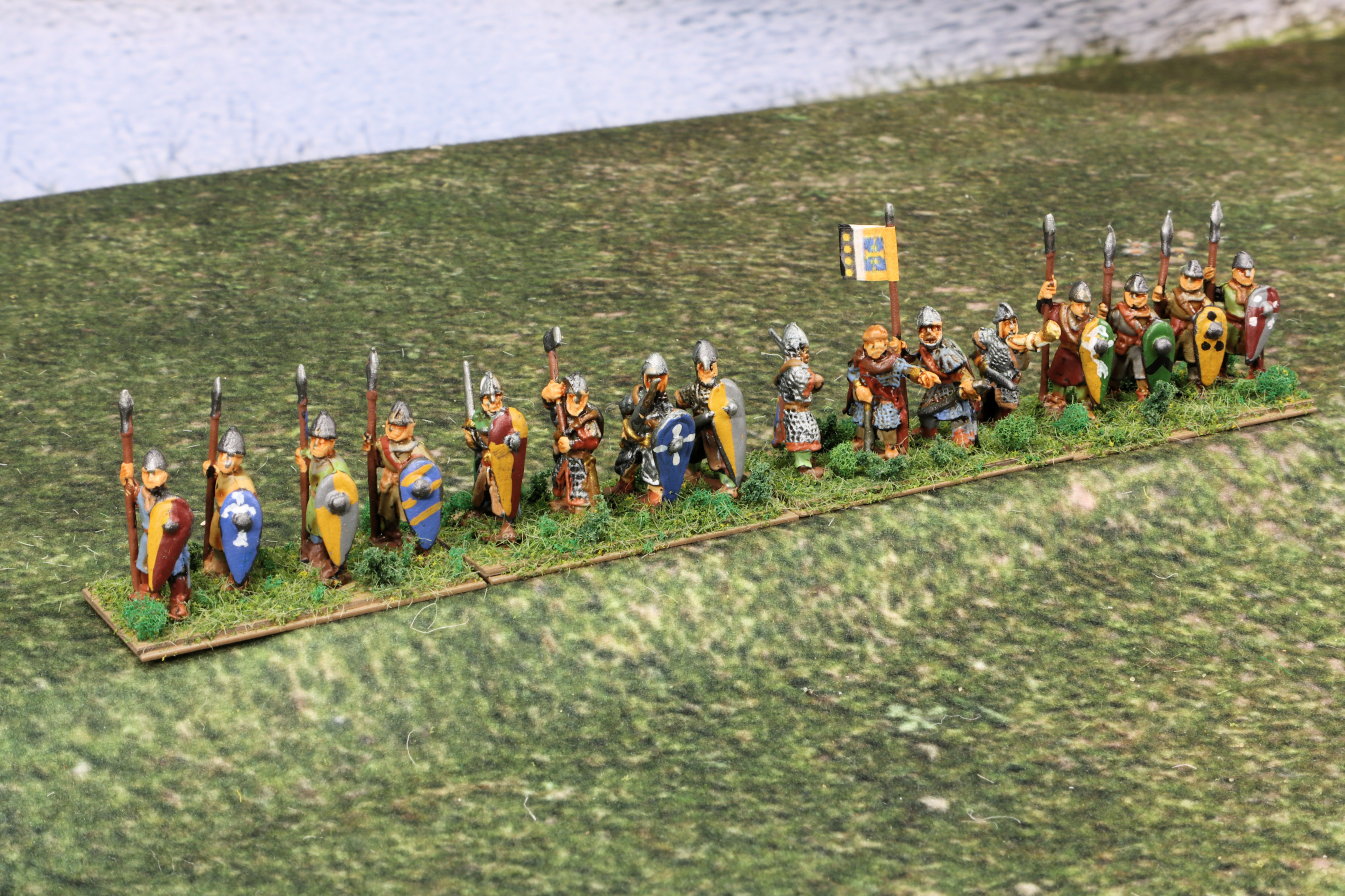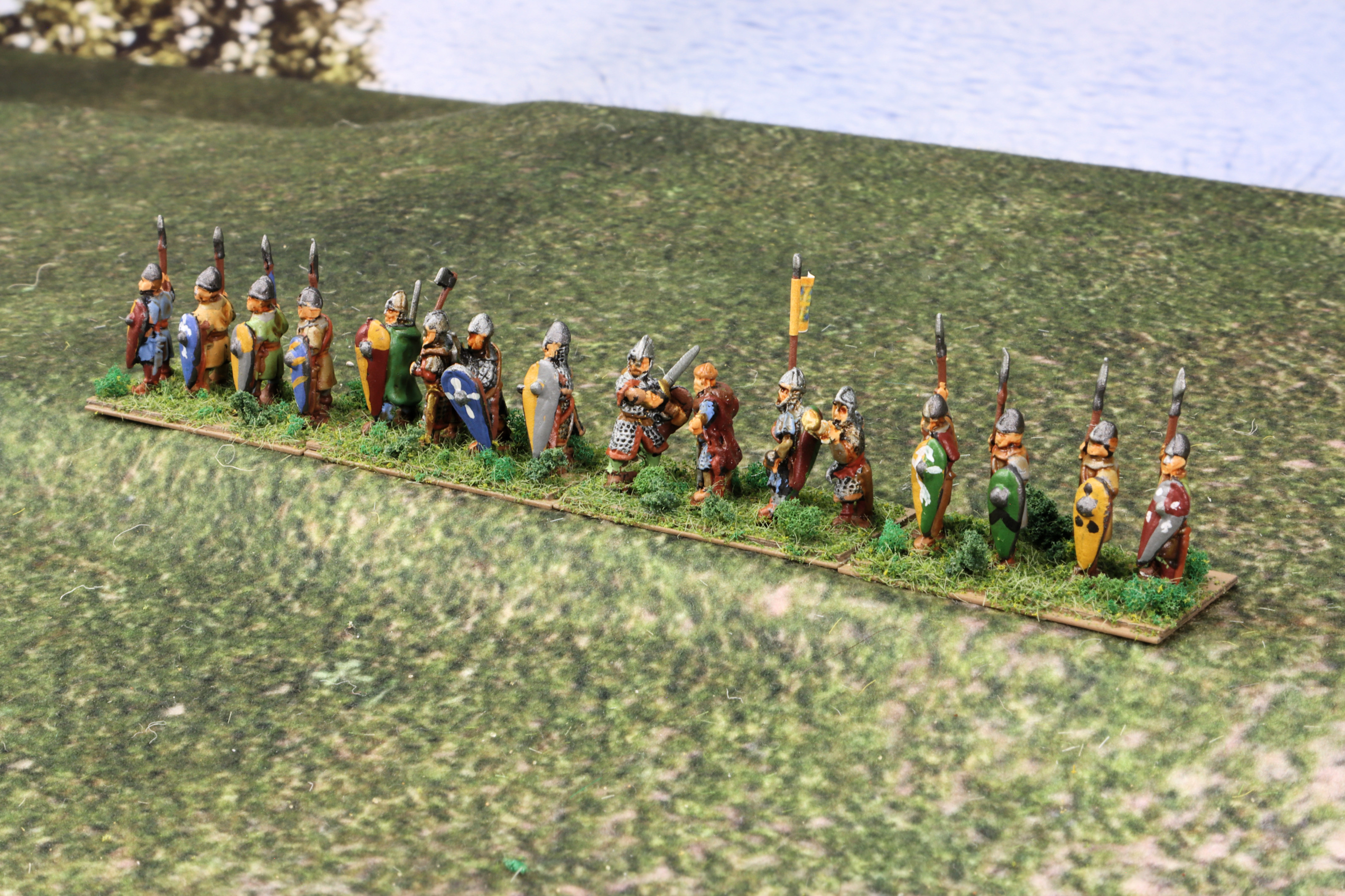 The two center units are blades, one of which has the dismounted leaders. The two flanking units are spearmen with their distincly Norman kite shaped shields.