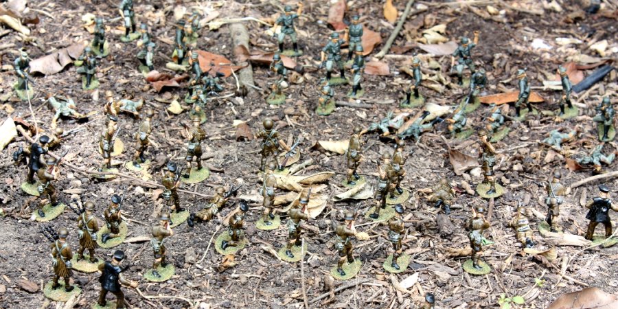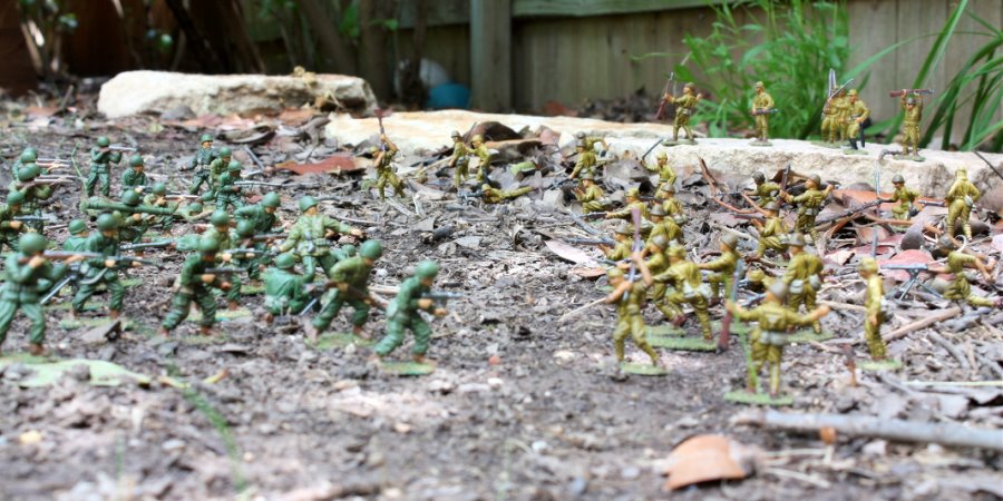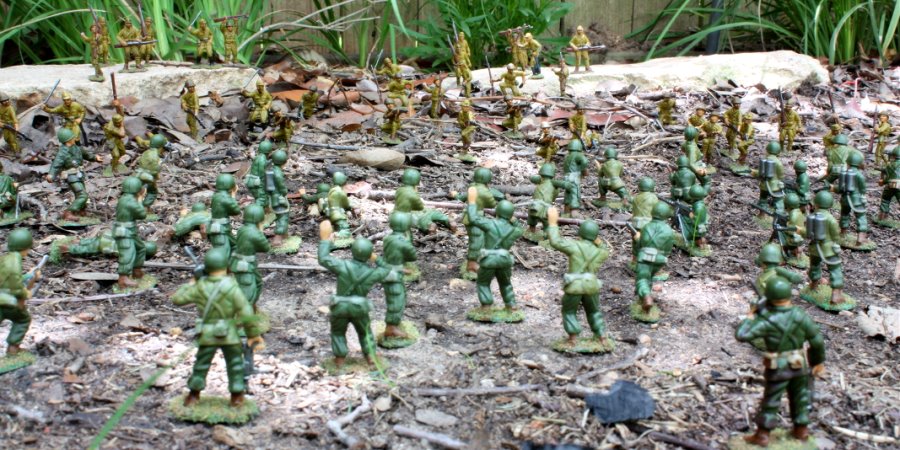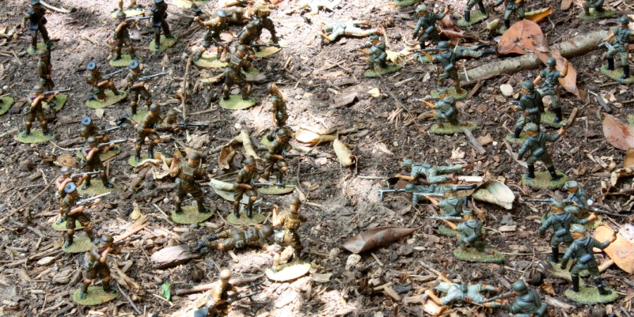 Enough of the studio poses.Here are the American and Japanese armies battling in the Guadalcanal jungle,a.k.a. the backyard.I was in such a hurry to take some photos, I shot the battleat high noon.This is not the best time of day to shoot.You get better photos from a diffuse light on a cloudy day, but I guessthese photos illustrate thecoolness and awesomeness of a massive infantry battle in the backyard.