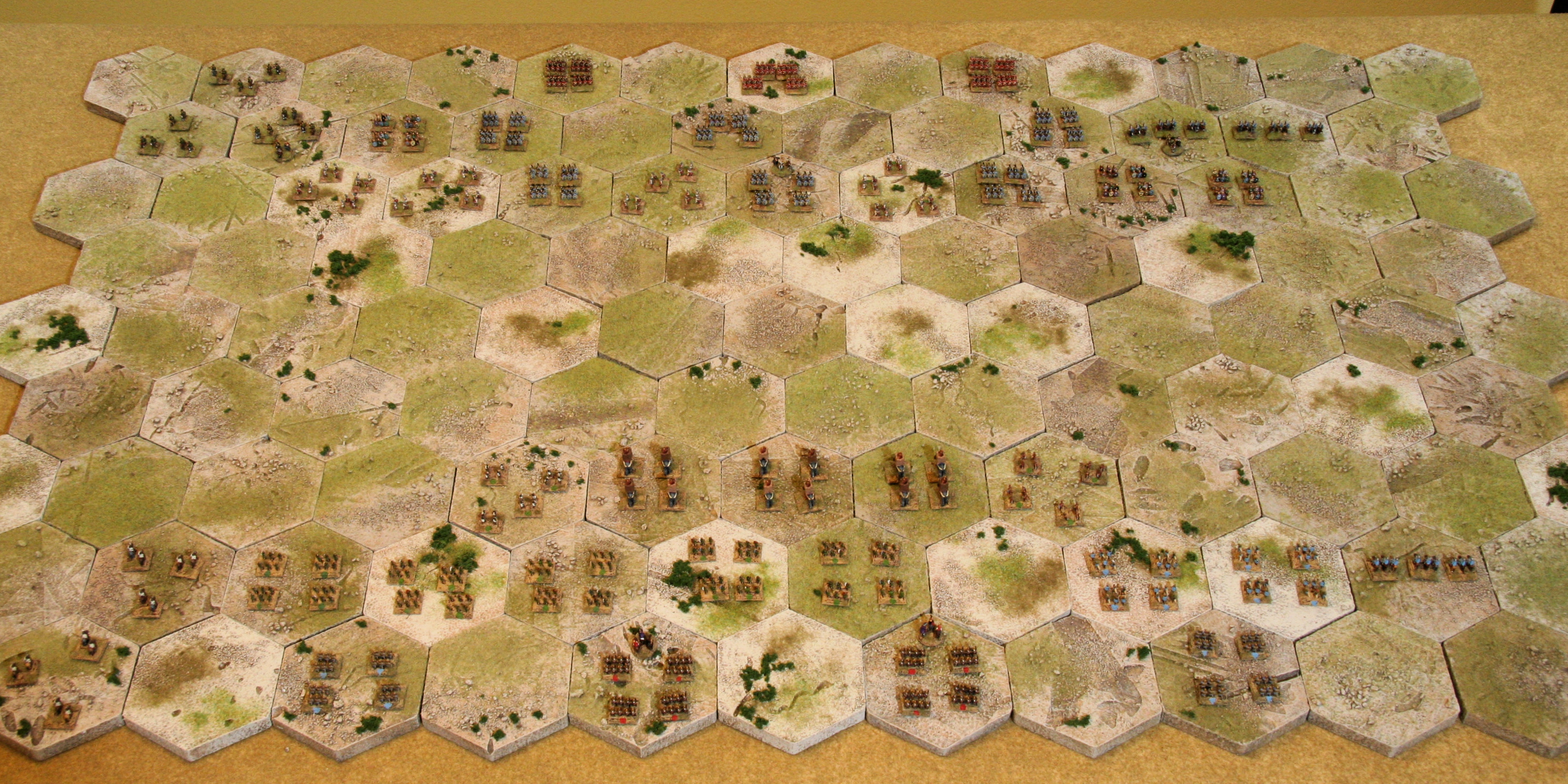 The Commands and Colors Ancients game is played on a 13 by 9 hex board. The game board is modeled here with GHQ Terrain Maker terrain hexes. There is also an article on how I constructed the GHQ terrain preview.