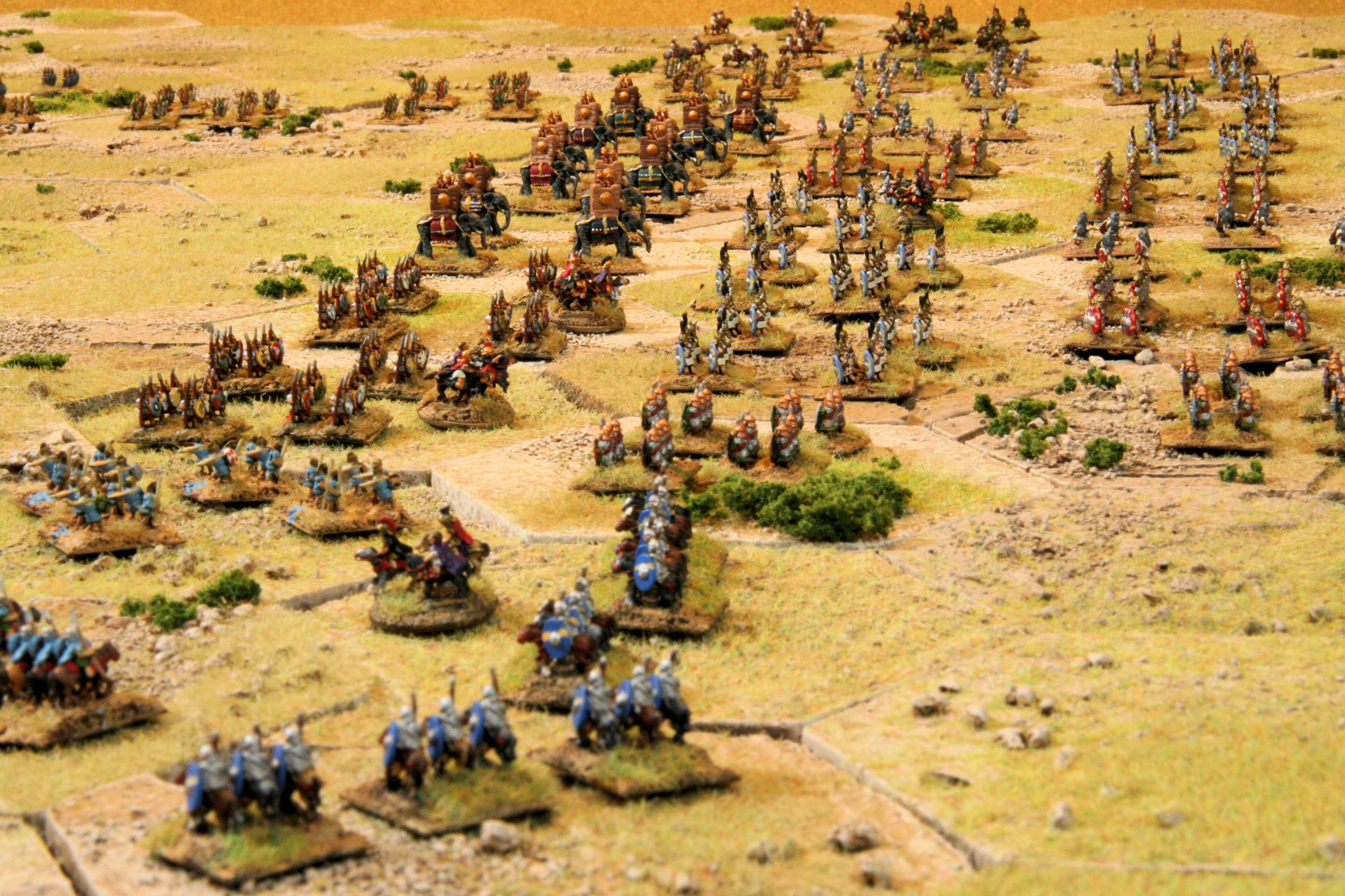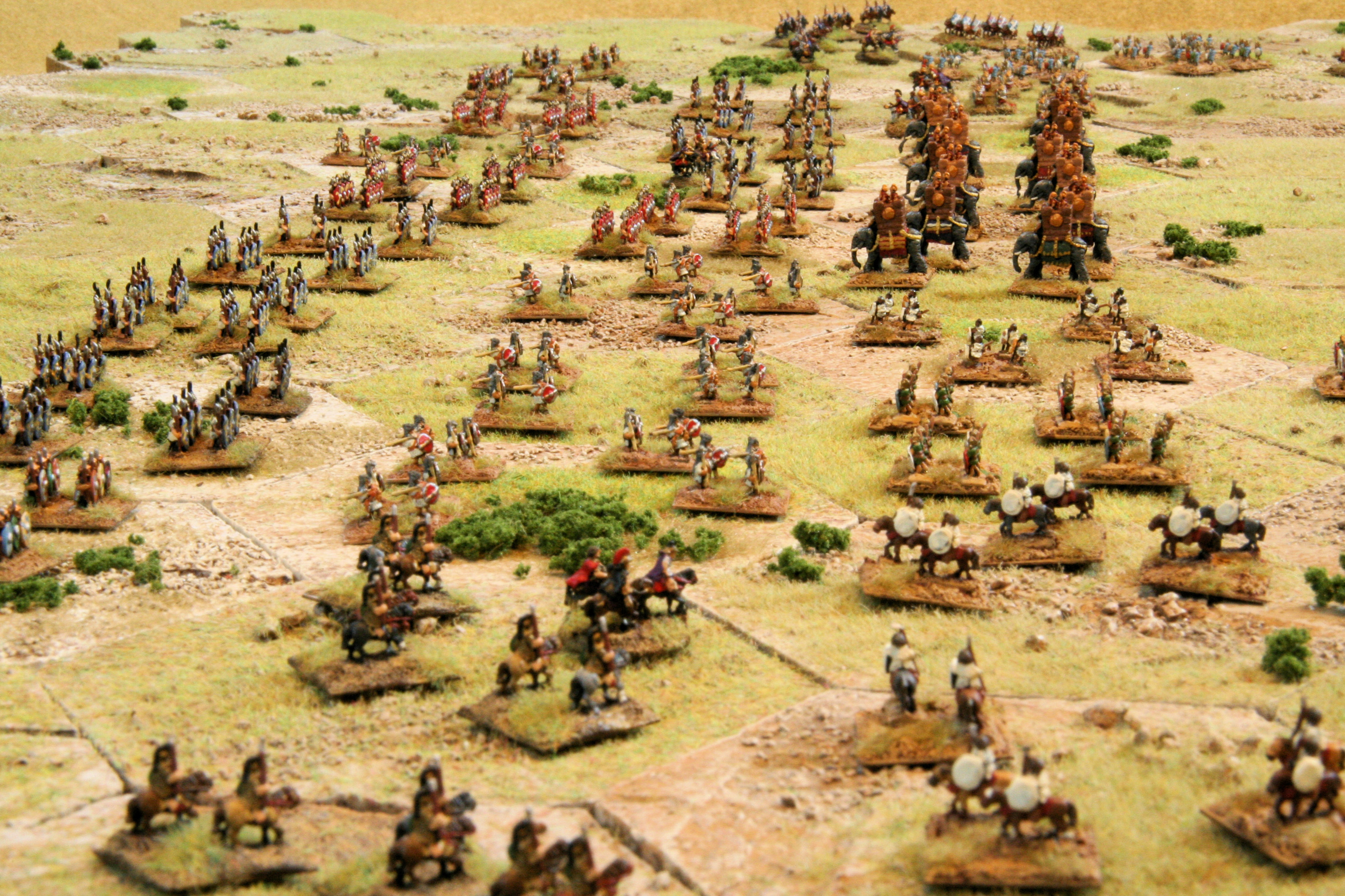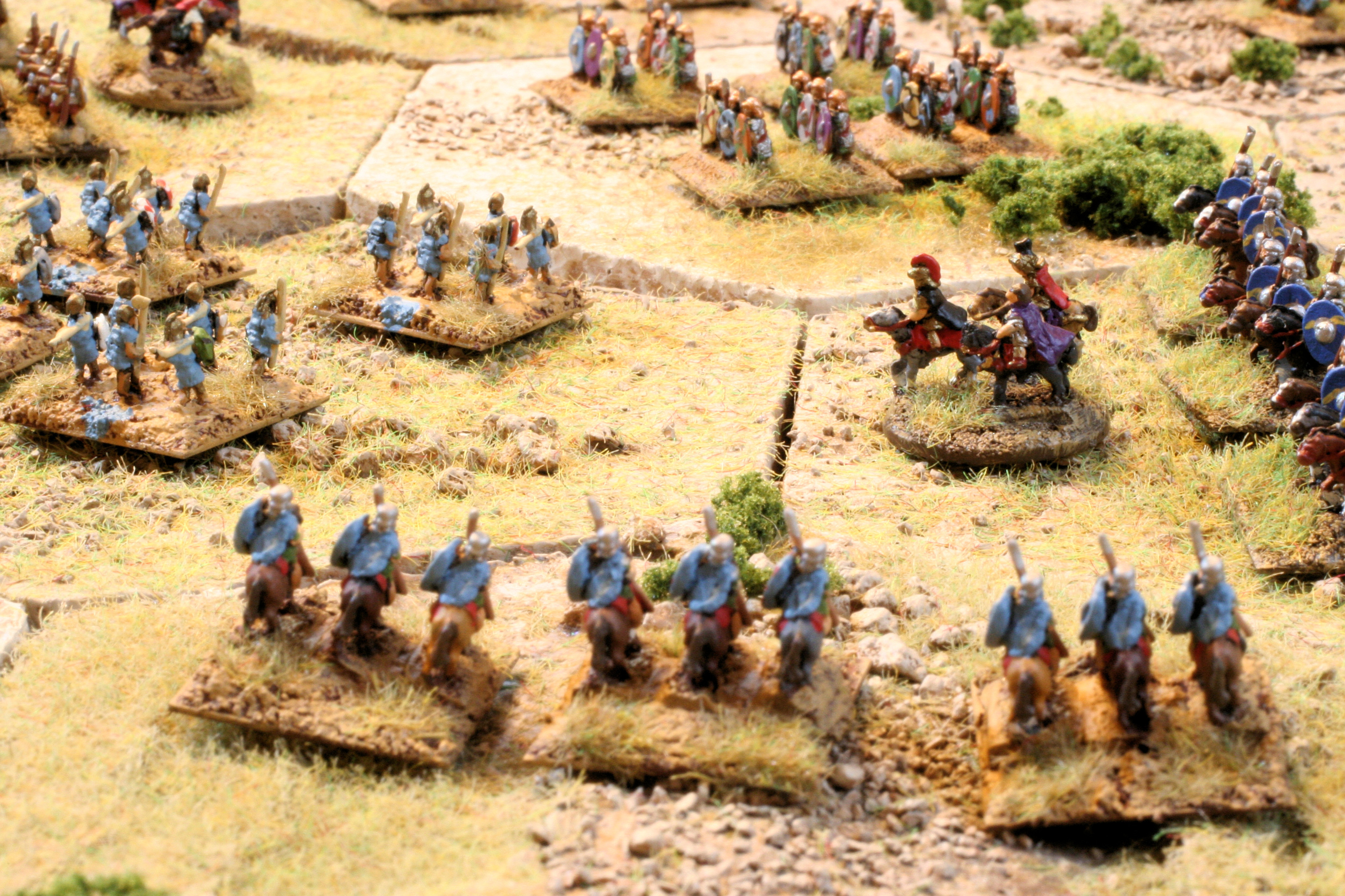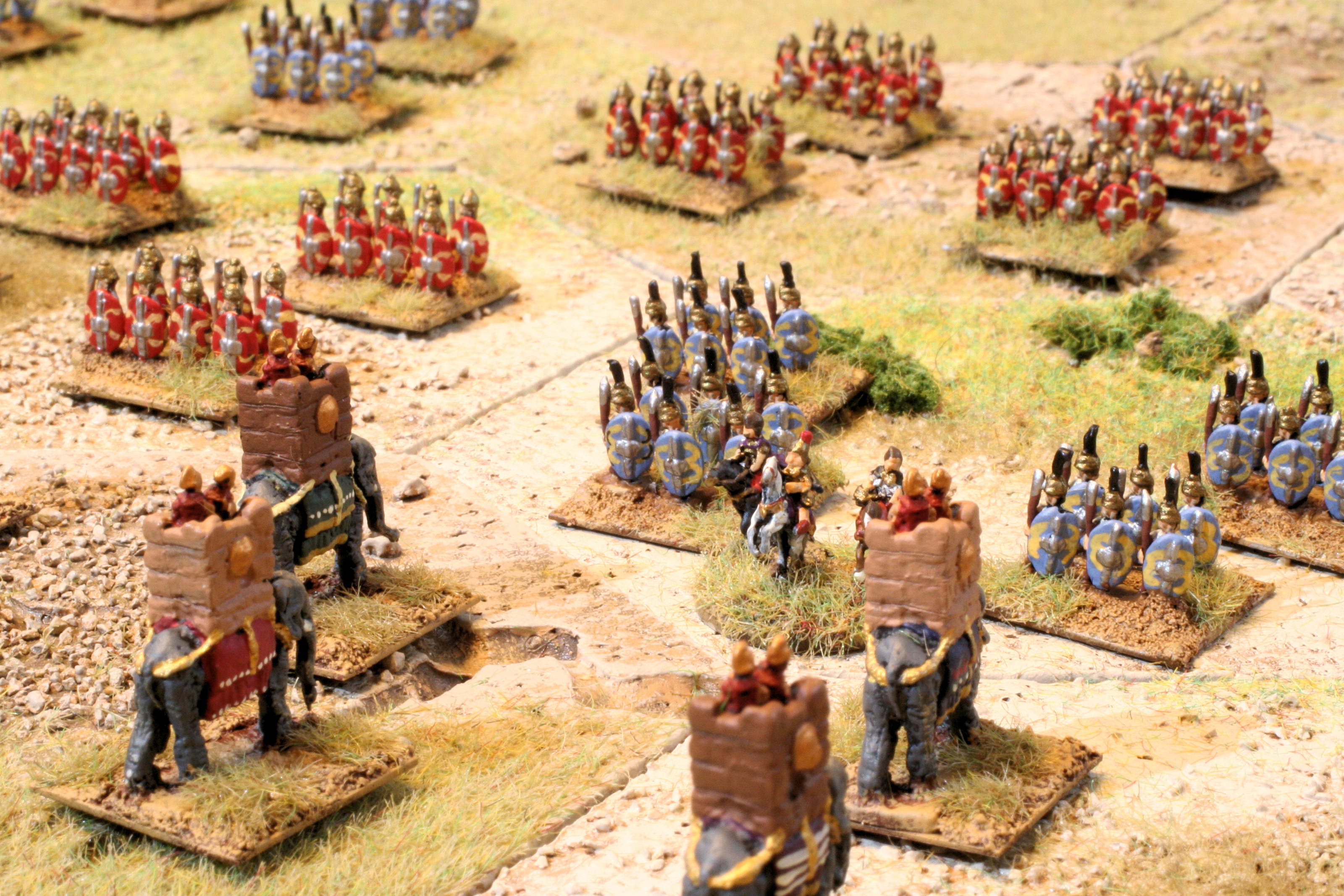 This photo shows the inital attack of the Carthaginian army. The Carthaginian army advances but the battle lines have not joined yet. The Carthaginian auxilia and elephants are ready to attack the Romans.