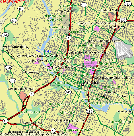 Below is a map of the Austin area. Click on the image to jump to a trail guide for the area. Most parks (shown in green) have an associated trail guide. Watch the status area of your browser as you pass your mouse cursor over the map to see which parks have completed trail guides.