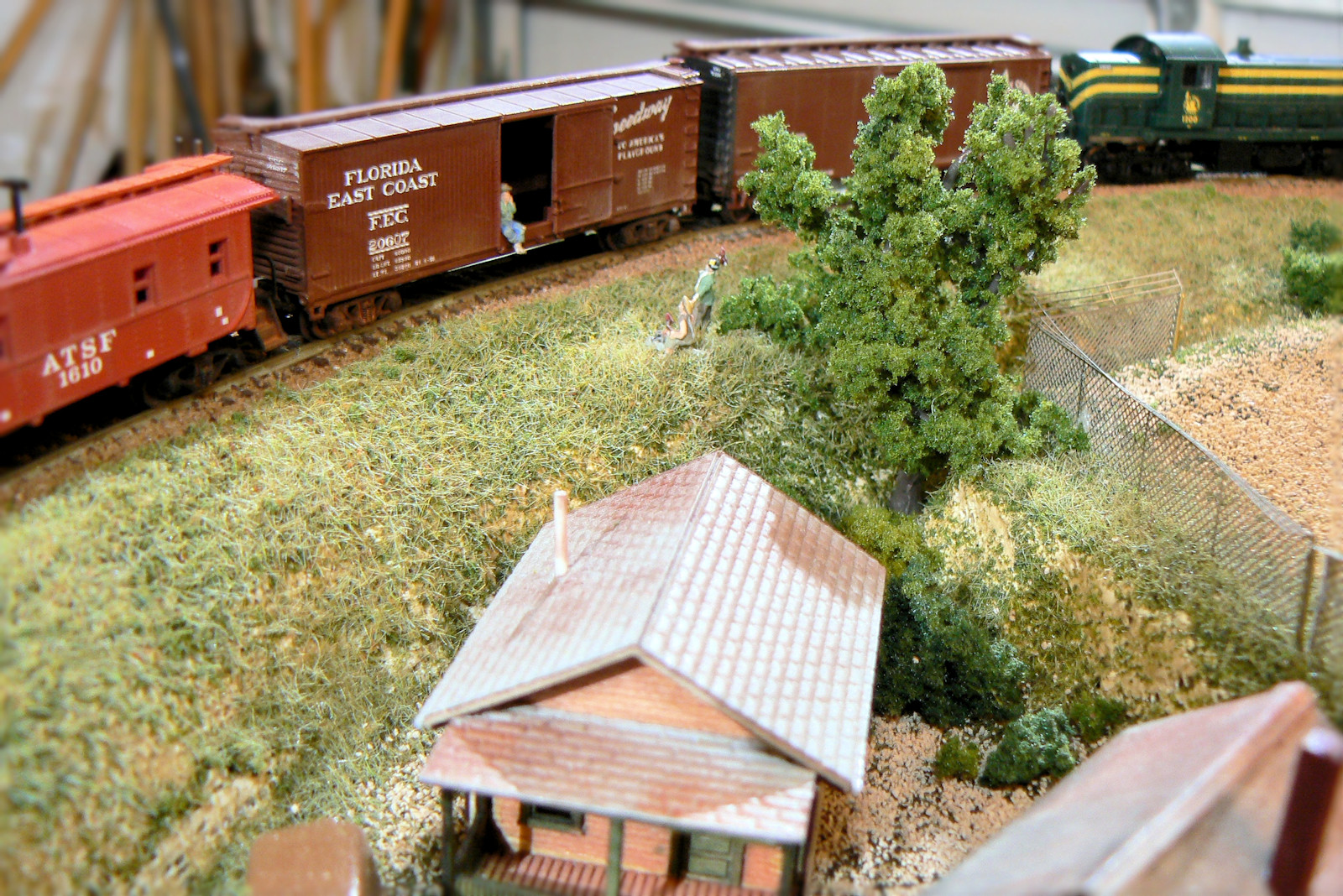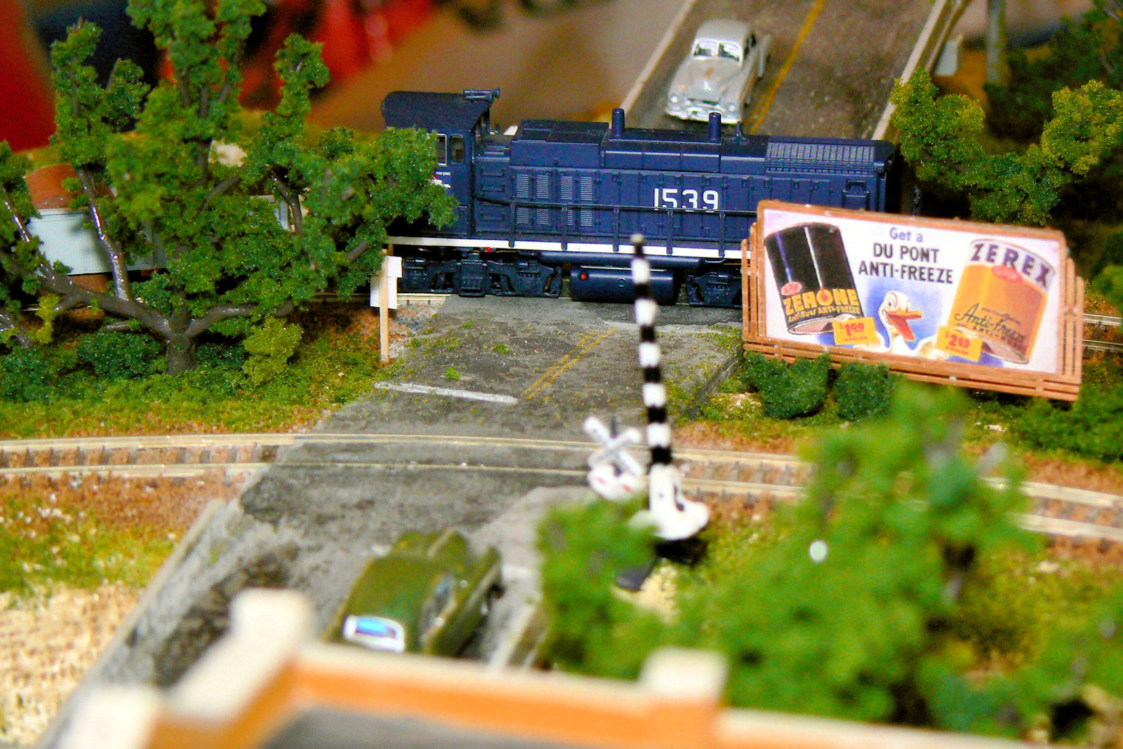 colorof the Missouri Pacific. As we say Mopac.I've added a bunch of doodads to the layout like this billboard, some crossing