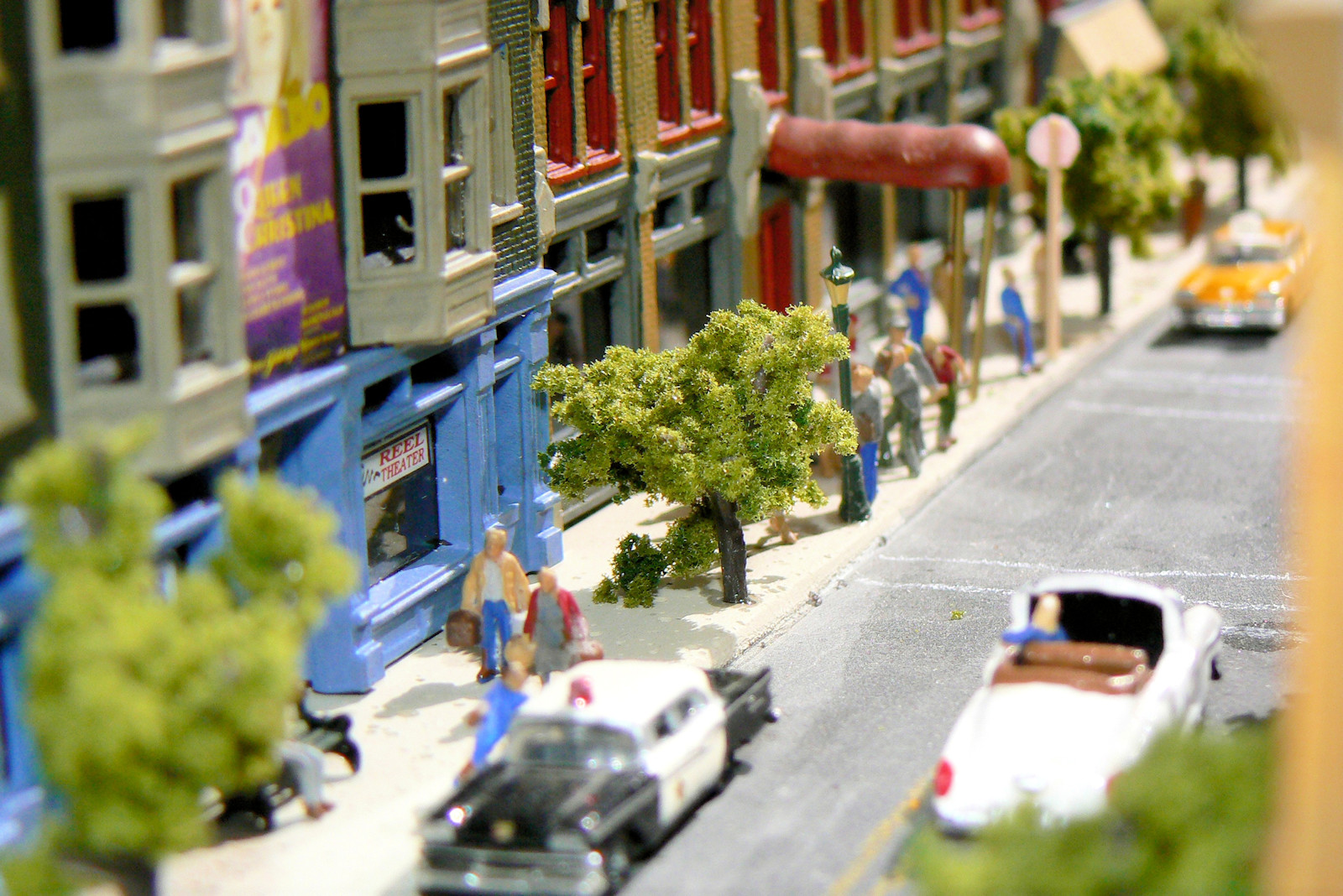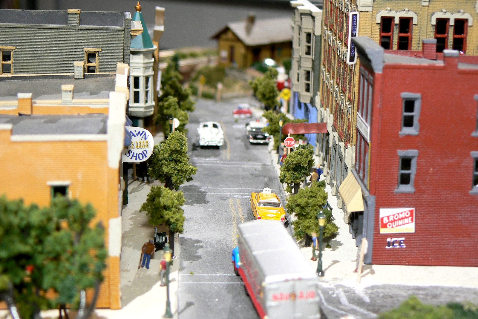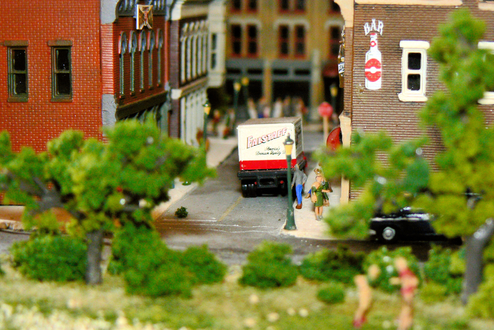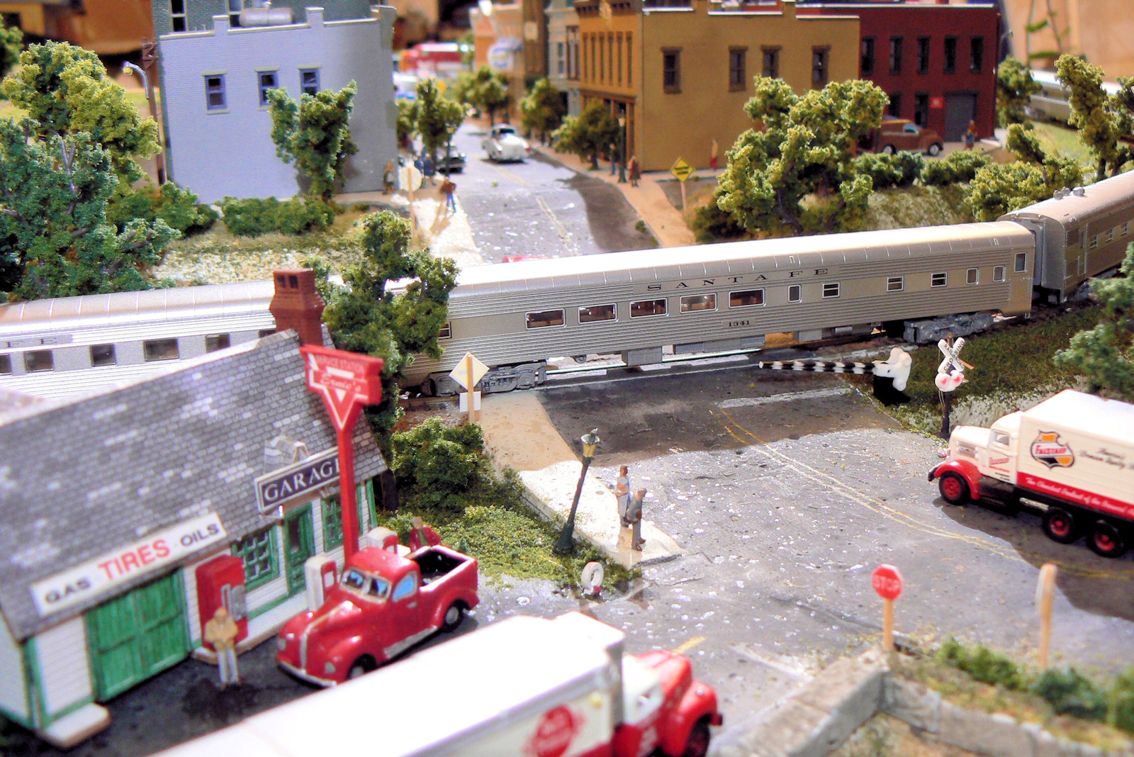There are also a bunch of N scale people (about 10 mm tall) walking about.You can buy them prepainted, but they are quite