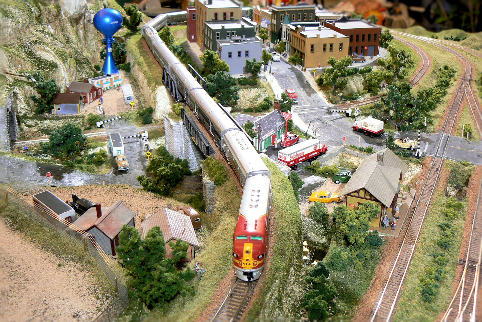 Here is the mammoth Super Chief pulling away from town.It sure is fun to get this one up to speed and whipping around the